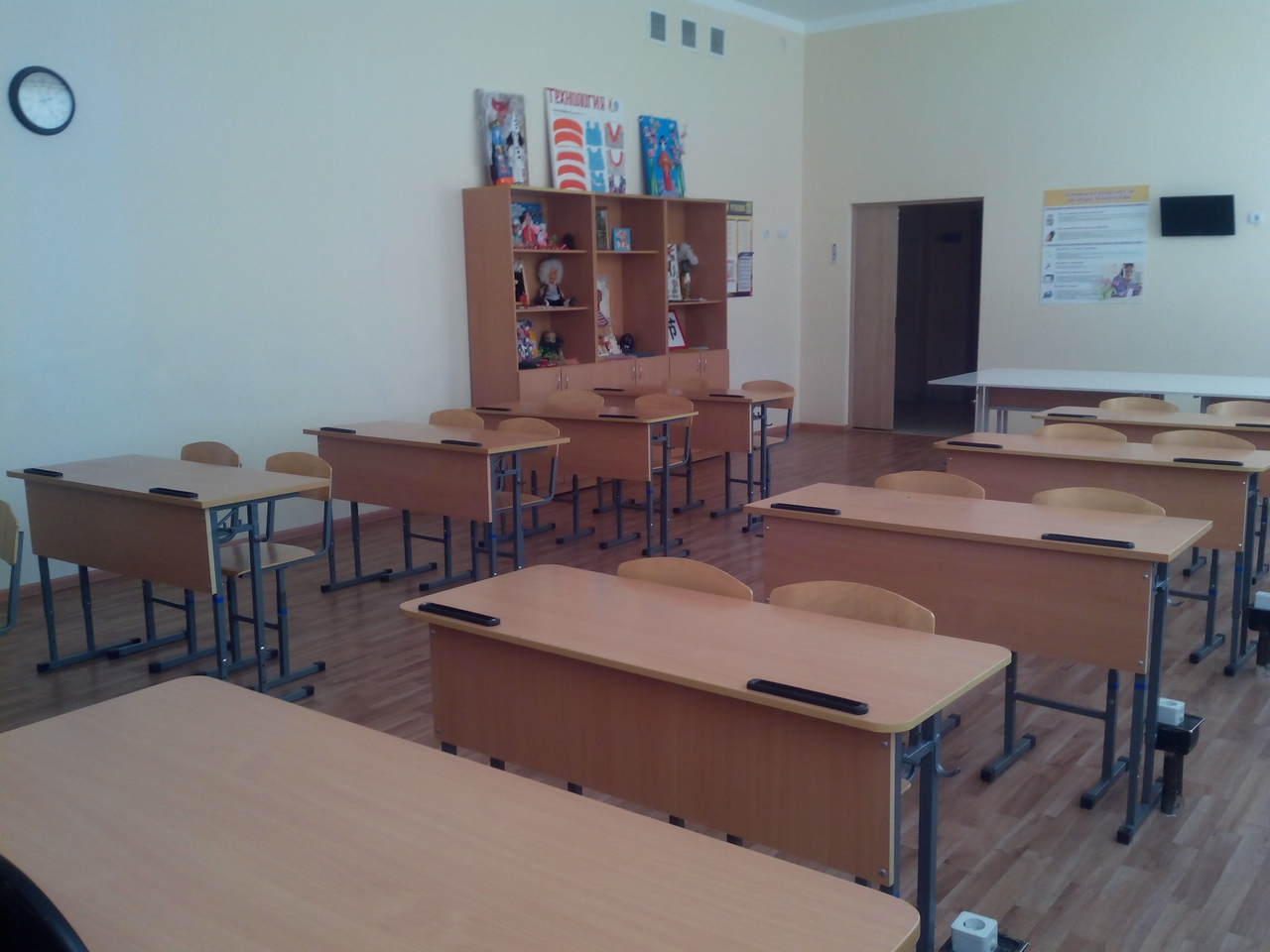 Эта часть представляет собой обычный учебный класс с партами, доской и столом учителя. Также здесь установлены стеллажи для хранения наглядных пособий. Класс технологии оснащен 2 компьютерами, ЖК телевизором.