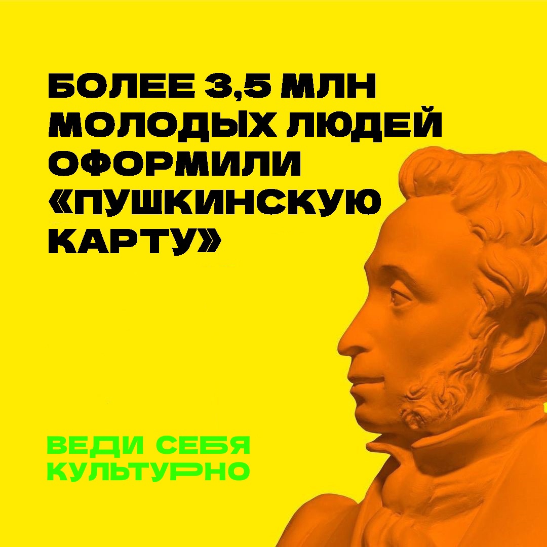 Всего за четыре месяца «Пушкинскую карту» получили более 3,5 млн молодых людей. Из них объем средств, которые держатели карт потратили в учреждениях культуры, превышает 1 млрд 420 млн рублей. Приобретено свыше 2,2 млн билетов.