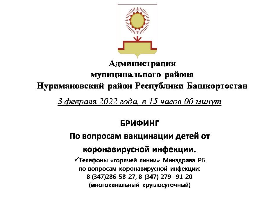 Уважаемые родители и законные представители! 3 февраля 2022 года в 15.00 часов состоится брифинг по вопросам вакцинации детей от коронавирусной инфекции с участием заместителя главы администрации муниципального района Нуримановский район Республики Башкортостан Ахтамьяновой М.Р., начальника МКУ Управление образования Мурзакаевой Г.Ш., педиатра, врача-инфекциониста ГБУЗ Нуримановская ЦРБ Емелиной Н.И. Интересующие Вас вопросы просим предварительно направлять по телефону 8(34776)22362 либо на электронную почту: nuriman.roo2@mail.ru с пометкой «На брифинг». Трансляция будет вестись на youtube канале, ссылка для подключения https://m.youtube.com/channel/UC7Mn3FIT4dTJEDKHbC8HEjw.