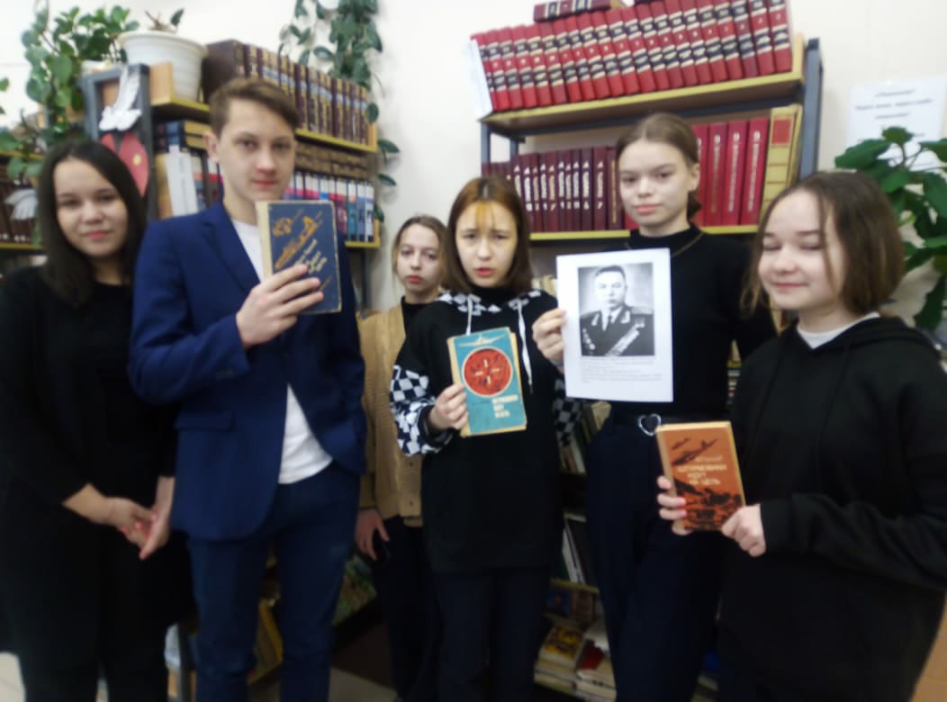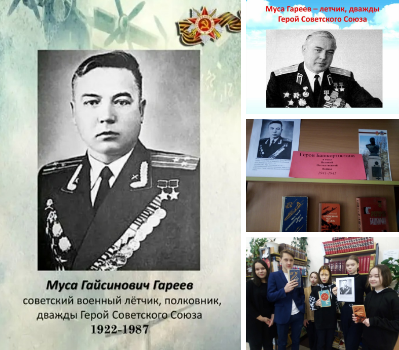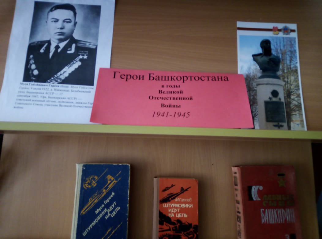 В школьной библиотеке оформлена книжная выставка, посвященная герою. Педагог-библиотекарь Байметова Наталья Сергеевна провела для обучающихся 8б класса патриотический час "Муса Гареев - славный сын Башкортостана". Ребята познакомились с биографией легендарного летчика.