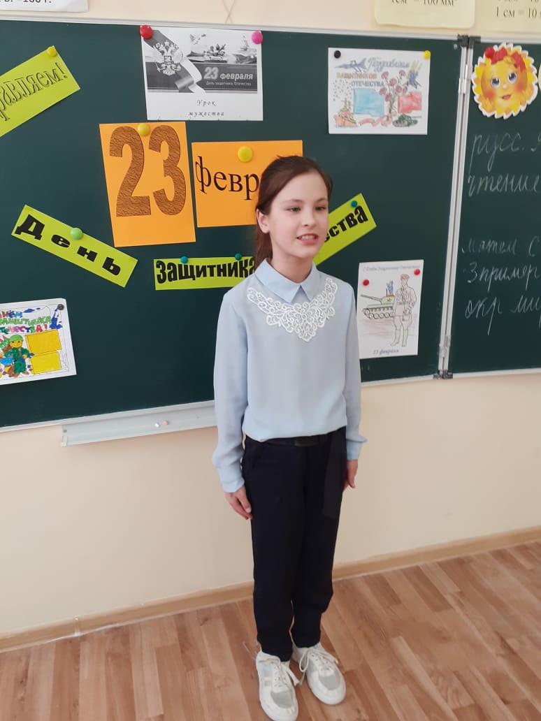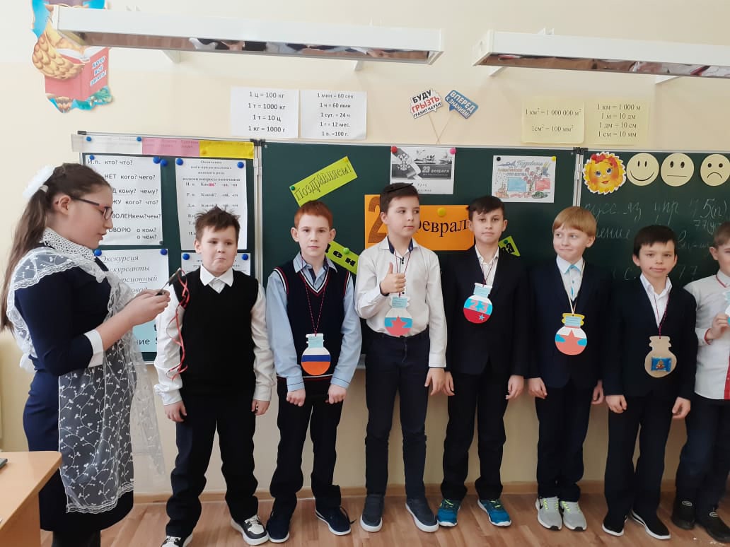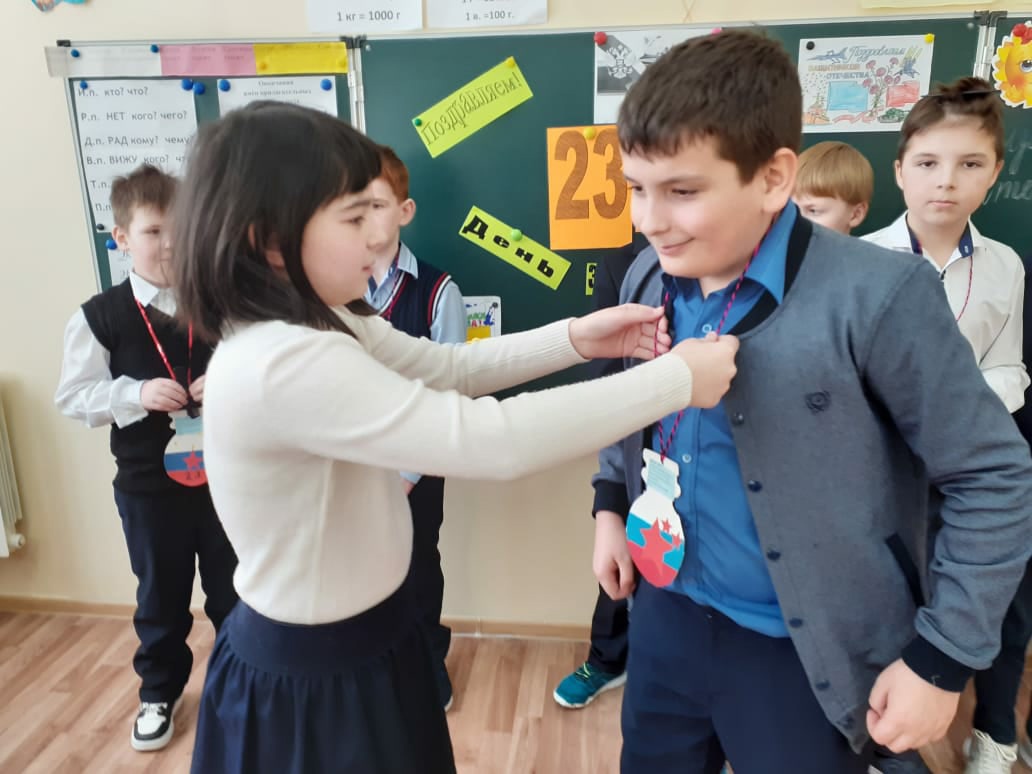 В 4 классе прошло мероприятие, посвящённое 23 февраля. Обучающиеся просмотрели видеоролик о защитниках Отечества, сами исполнили песню под названием "Защитники Отечества". Девочки рассказали стихи и вручили мальчикам памятные медальки с различными номинациями. Было очень интересно. Классный руководитель Сагитова Елизавета Алисовна поздравила будущих защитников: десантников и моряков, пехотинцев и пограничников с этим праздником.