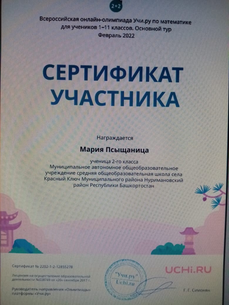 - Сертификатом участника - Псыщаница Мария.