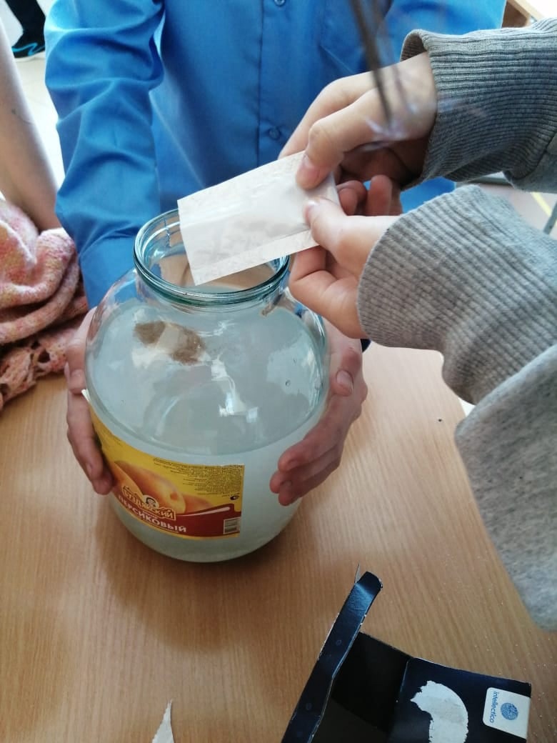 Работу проводили строго в соответствии с инструкцией: в смесь из раствора морской соли и песка ребята поместили цисты артемии. Рачки должны появиться на вторые сутки. Ждем с нетерпением!
