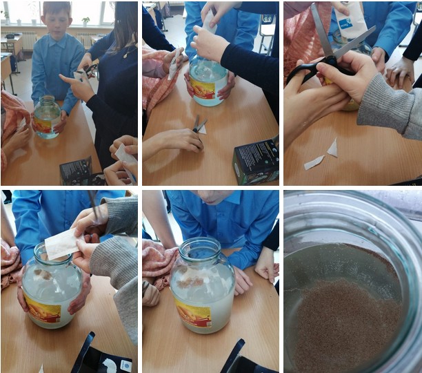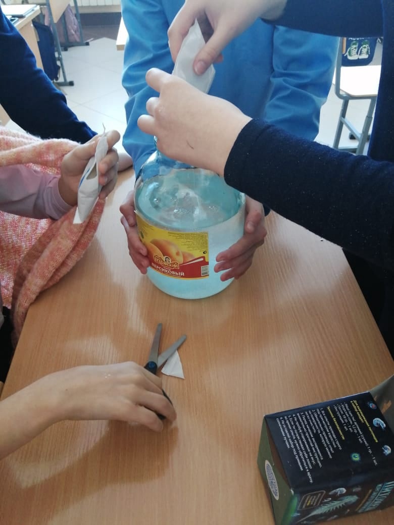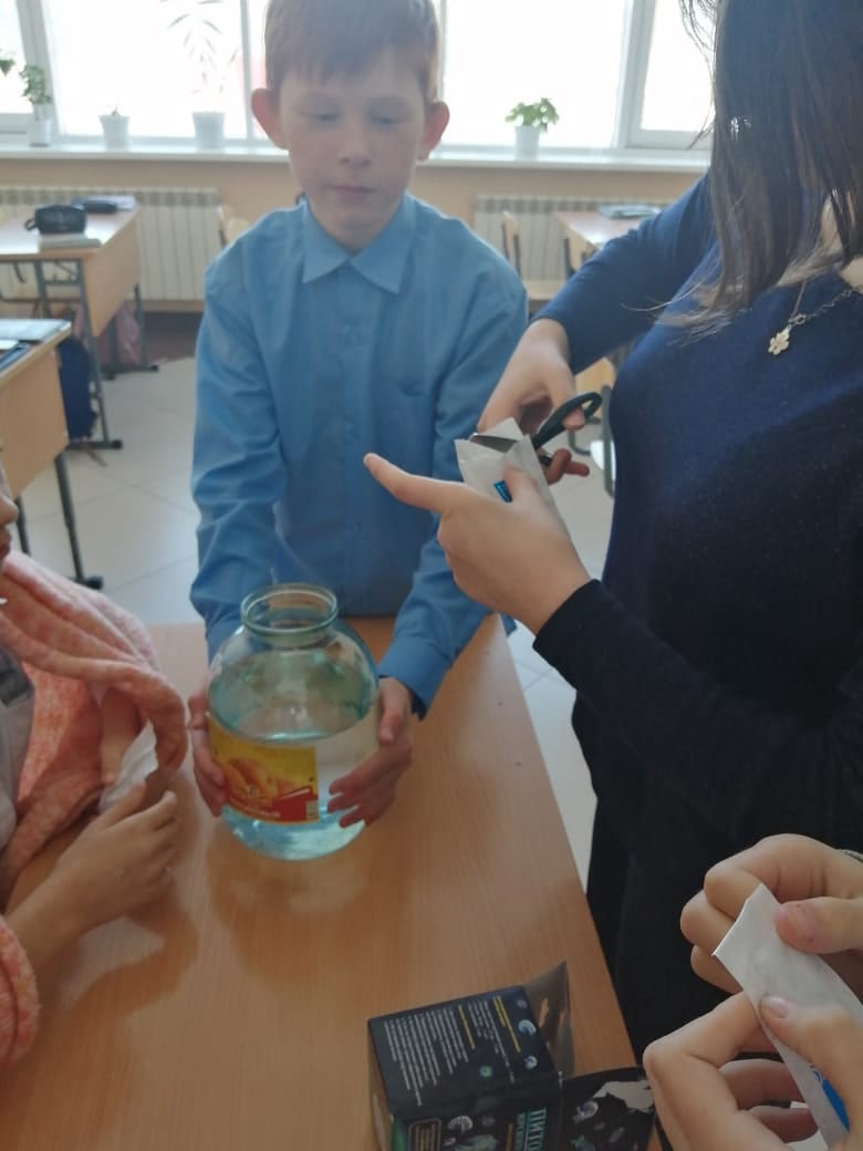 В рамках занятия "Практическая биология" учащиеся 7б класса проводят опыт по выращиванию питомцев Юрского периода - древних микроскопических рачков-артемии