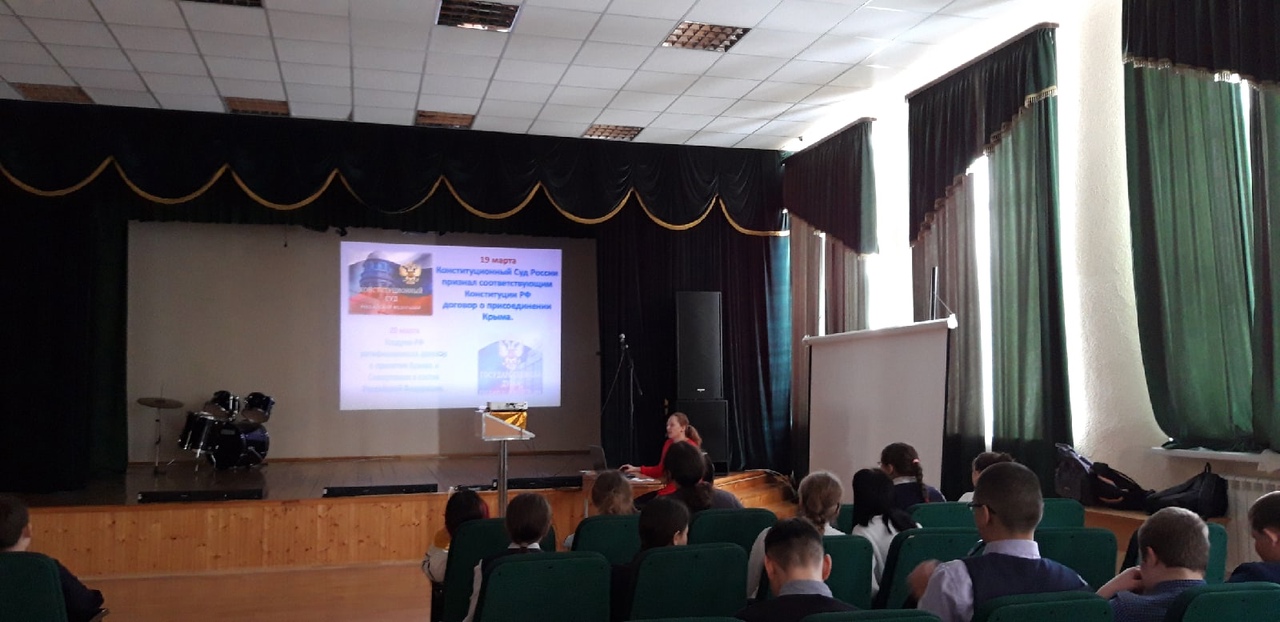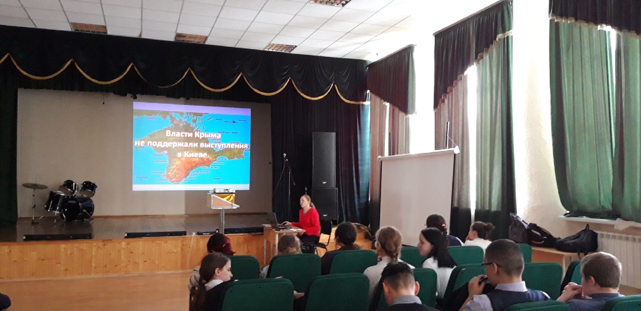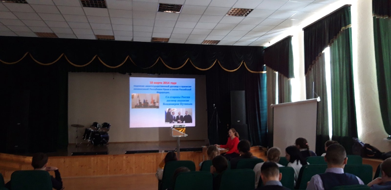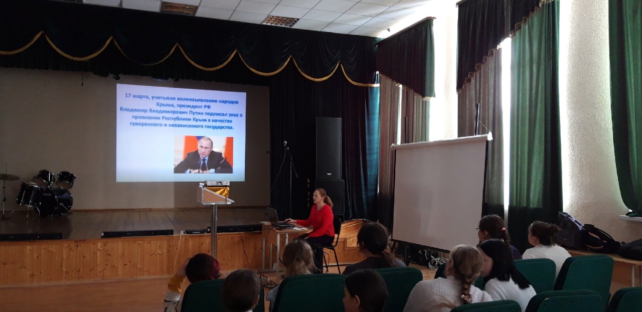 С целью гражданско-патриотического воспитания и в связи с исторической датой присоединения Крыма к России сегодня для учеников 6а класса был проведен классный час «Крымская весна». Классный руководитель Крестьянинова Н.А. рассказала ребятам об истории Крыма, о событиях, приведших к всенародному референдуму и о создании Крымской Республики. Учащиеся получили сведения о географическом положении полуострова, о его историческом и культурном прошлом, смогли "побывать" в Крыму, благодаря виртуальной экскурсии. Посмотрели основные достопримечательности.