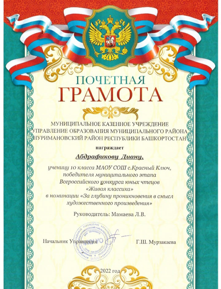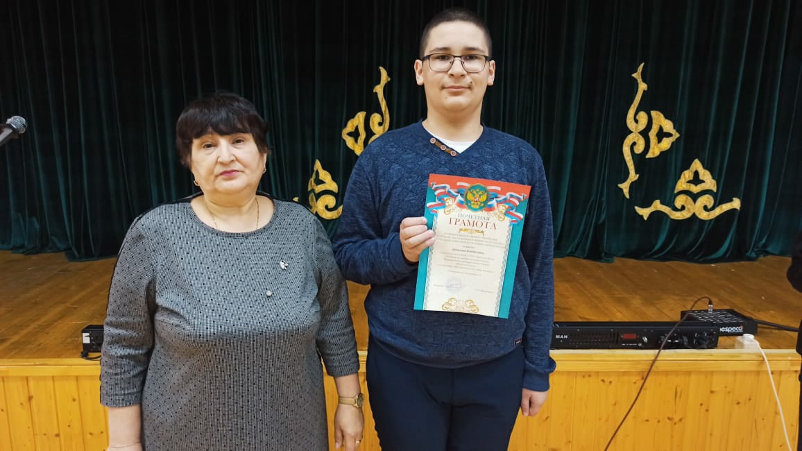 Данилов Владислав, ученик 6а класса, победитель в номинации "За оригинальный выбор текста" (руководитель Ахмадиева З.С.), Абдрафикова Диана, ученица 10 класса, победитель в номинации "За глубину проникновения в смысл художественного исполнения" (руководитель Мамаева Л.В.).