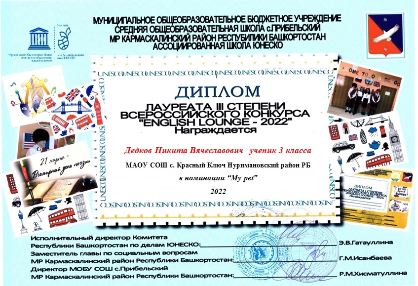 Подведены итоги Всероссийского конкурса "Английская гостиная" в номинации "My pet" (Мой домашний любимчик). В возрастной категории 2-3 класс Лауреатом III степени стал учащийся 3а класса Дедков Никита (руководитель Коленченко Анна Вадимовна), в возрастной категории 4-5 классы Лауреатом III степени стала Щеглова Карина (руководитель Полежаева Милана Александровна).