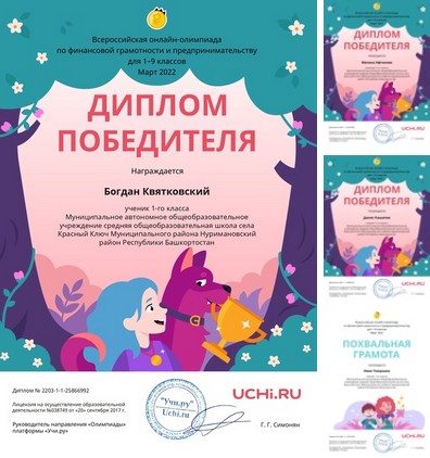 - Дипломом победителя: Афтахова Милана, Кашапов Данис, Квятковский Богдан;
