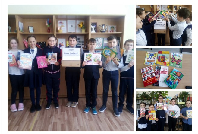 Ученики 6а и 4 классов присоединяются к акции "Книги Донбассу". Ребята принесли из дома детские художественные книги, учебные энциклопедии. Благодаря этой акции, взрослые и дети Донбасса получат возможность читать любимую литературу.