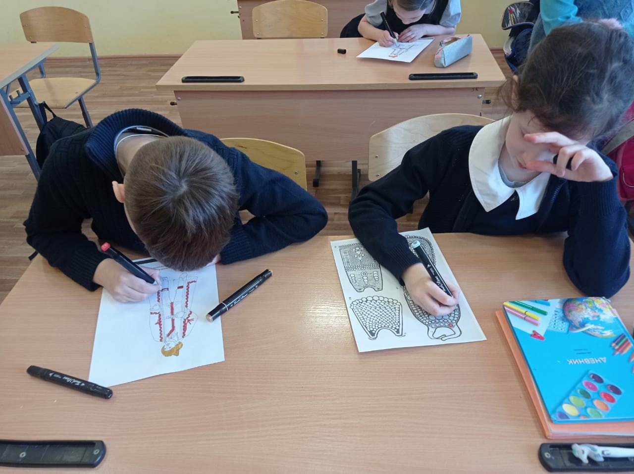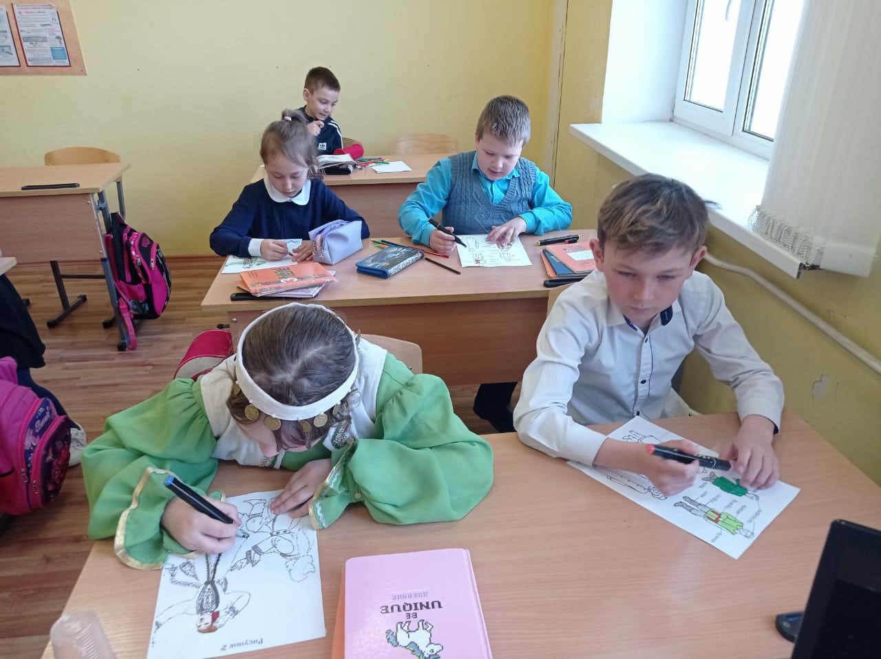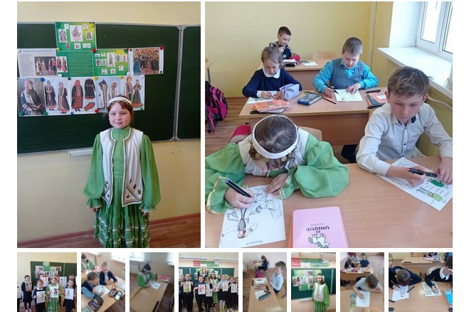 Очень ярко и празднично прошли сегодня уроки башкирского языка в 3 классах. Учитель Арбузова Рамзиля Фирдаусовна познакомила ребят с историей башкирского костюма, с использованием орнаментов и узоров на костюмах. Ученики отработали на практике, в какой цветовой гамме нужно раскрашивать праздничные наряды народов Башкортостана.