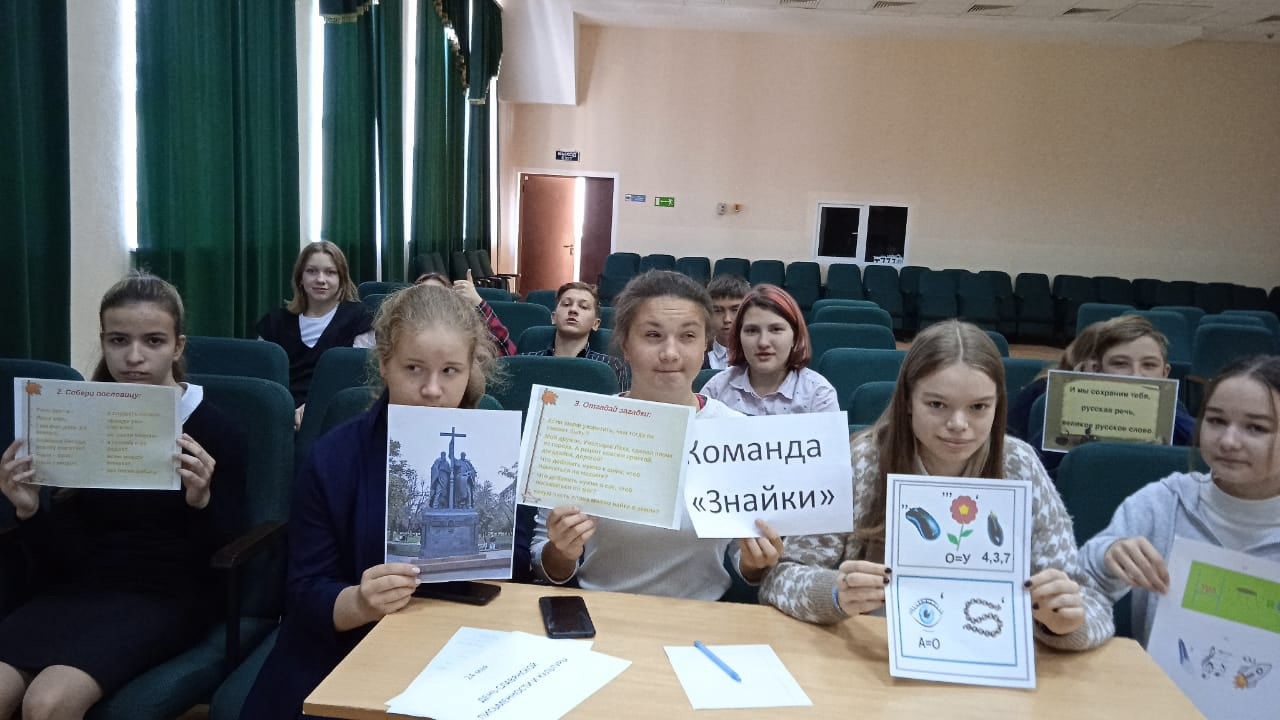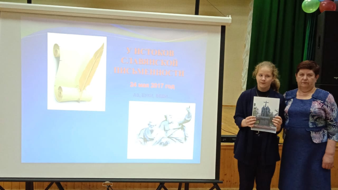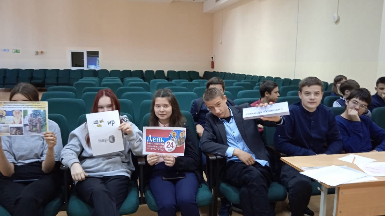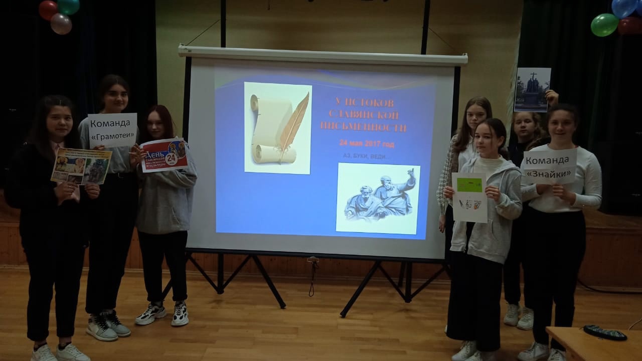 24 мая на уроке русского языка учащиеся 8 а и 8 б смотрели презентацию" У истоков Славянской письменности ", посвященную Дню Славянской письменности и узнали о происхождении праздника, о создателях азбуки Кирилле и Мефодии. Разделившись на команды "Знайки" (8а класс) и "Умники" (8б класс) , ребята увлечённо разгадывали викторину. По итогам выполненных заданий, победителями стала команда "Умники". Активные ребята: Ахматдинова Айгуль, Голкова Варвара, Сайфуллина Анна, Абдрафикова Динара, Юшкова Валерия, Хабутдинова Алина получили медали "Знаток русского языка" и "Самая умная". Познавали русский язык весело и дружно!