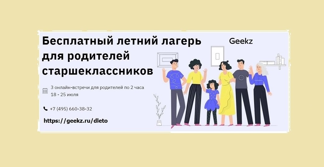 С 18.07 до 25.07 2022 года образовательный центр Geekz запускает "Второй сезон" бесплатного летнего онлайн-лагеря для родителей старшеклассников.