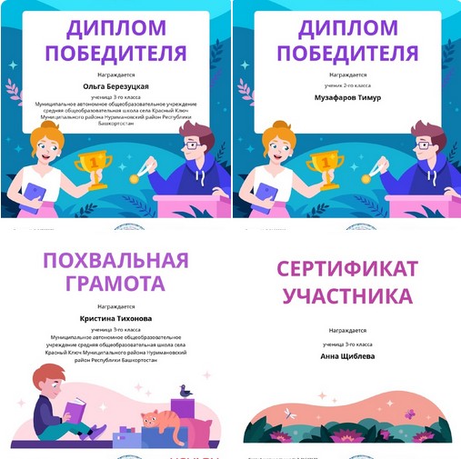 Учащиеся 3б класса приняли участие в сентябрьской Всероссийской онлайн-олимпиаде по русскому языку и литературе, которая проходила на образовательной платформе Учи.ру. Дипломом победителя награждены Музафаров Тимур и Березуцкая Ольга, Похвальной грамотой - Тихонов Кристина, Сертификатом участника - Щиблева Анна.