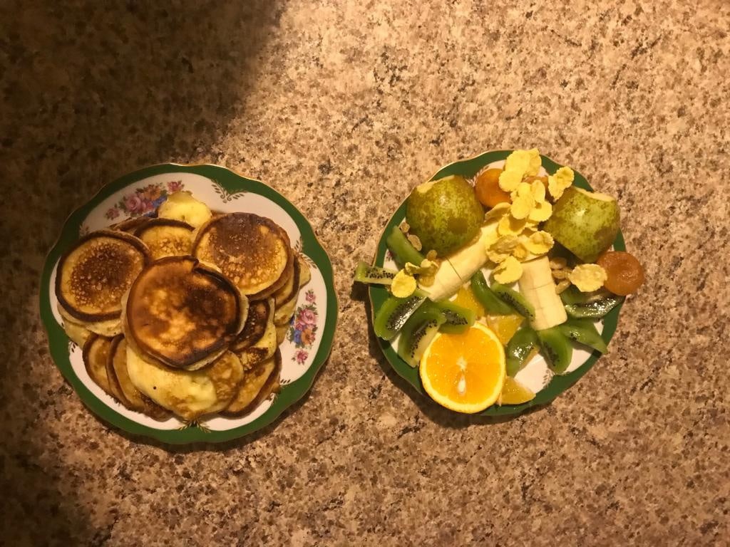 Анна, совместно с мамой, приготовила оладушки и фруктовое ассорти.