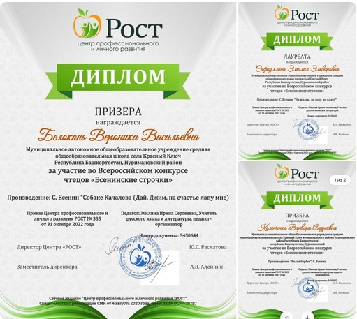 Во Всероссийском конкурсе чтецов "Есенинские строчки" приняли участие наши ученики. Дипломом призёра награждены Белоконь Вероника (7б класс) и Коленченко Варвара (1а класс). Дипломом лауреата награждена Сафиуллина Эмилия (7б класс).