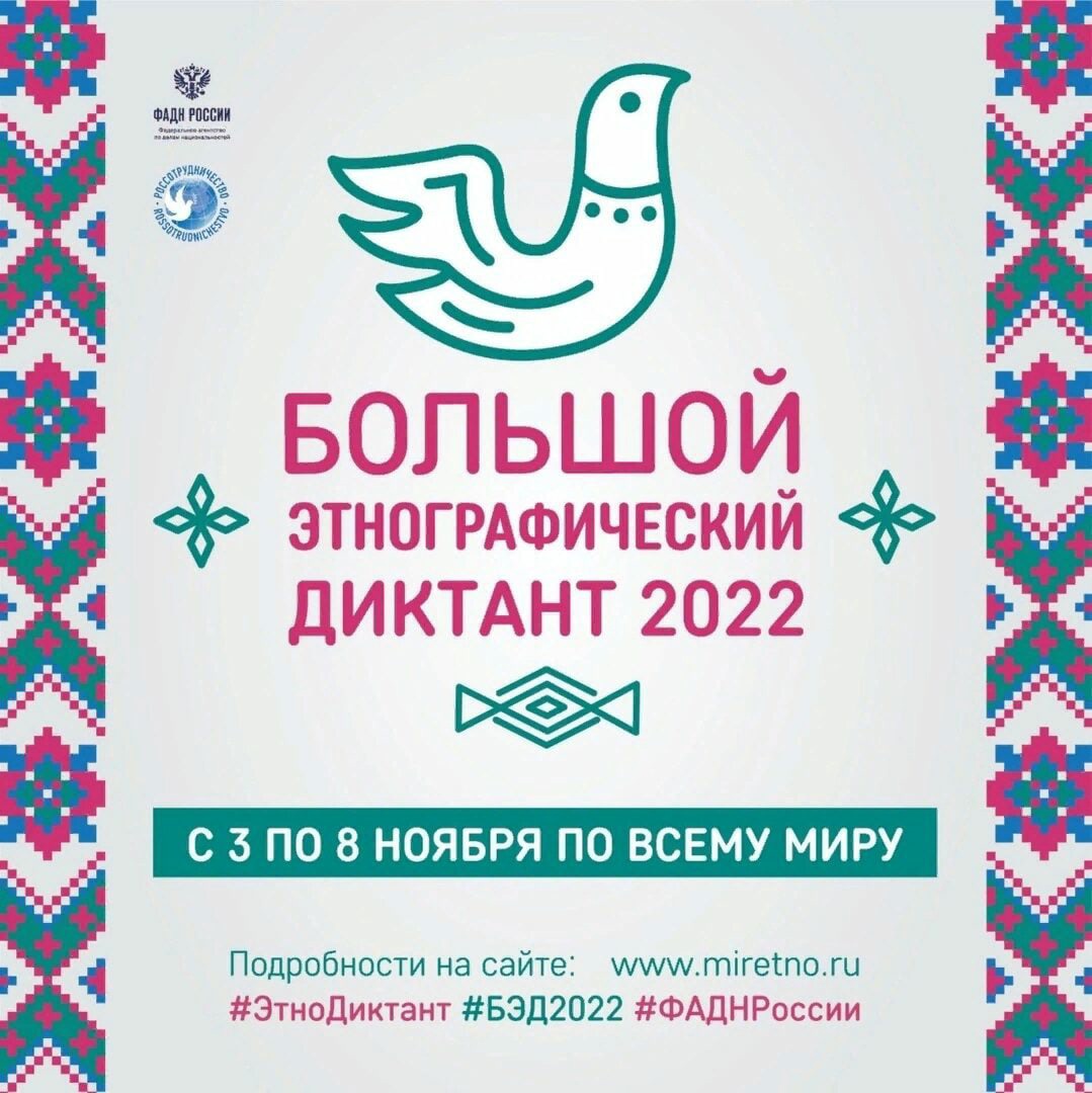 В 2022 году Международная просветительская акция «Большой этнографический диктант» состоится в седьмой раз и пройдет под лозунгом «Народов много – страна одна!». Диктант проводится в канун Дня народного единства с 3 по 8 ноября 2022 года в онлайн-формате.Организатором Диктанта является Федеральное агентство по делам национальностей.