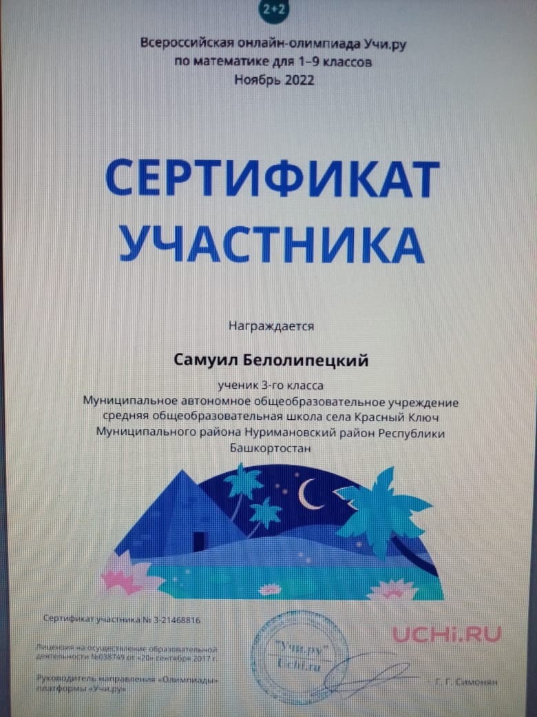 Сертификатом участника - Белолипецкий Самуил, Псыщаница Мария.