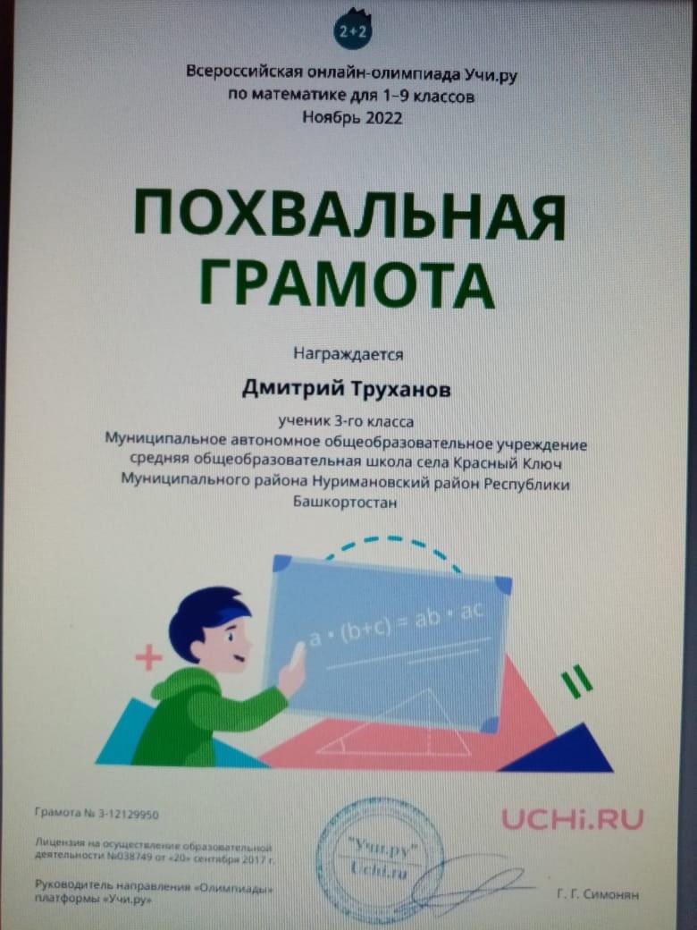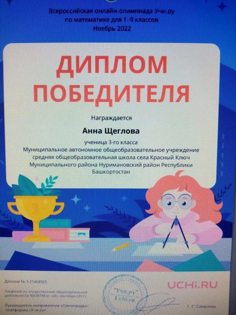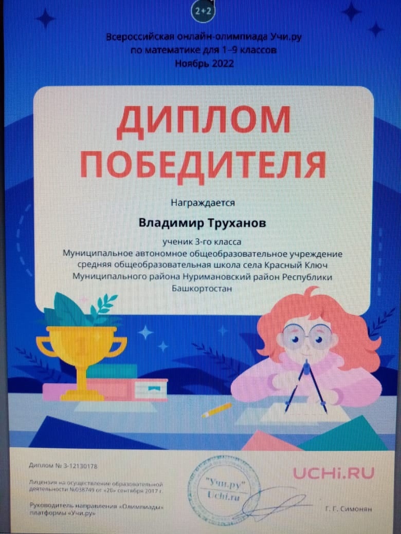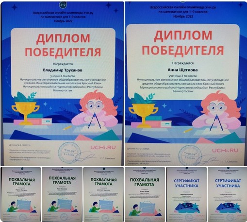 Дипломом победителя всероссийской онлайн-олимпиады по математике Учи.ру награждены: Труханов Владимир и Щеглова Анна;