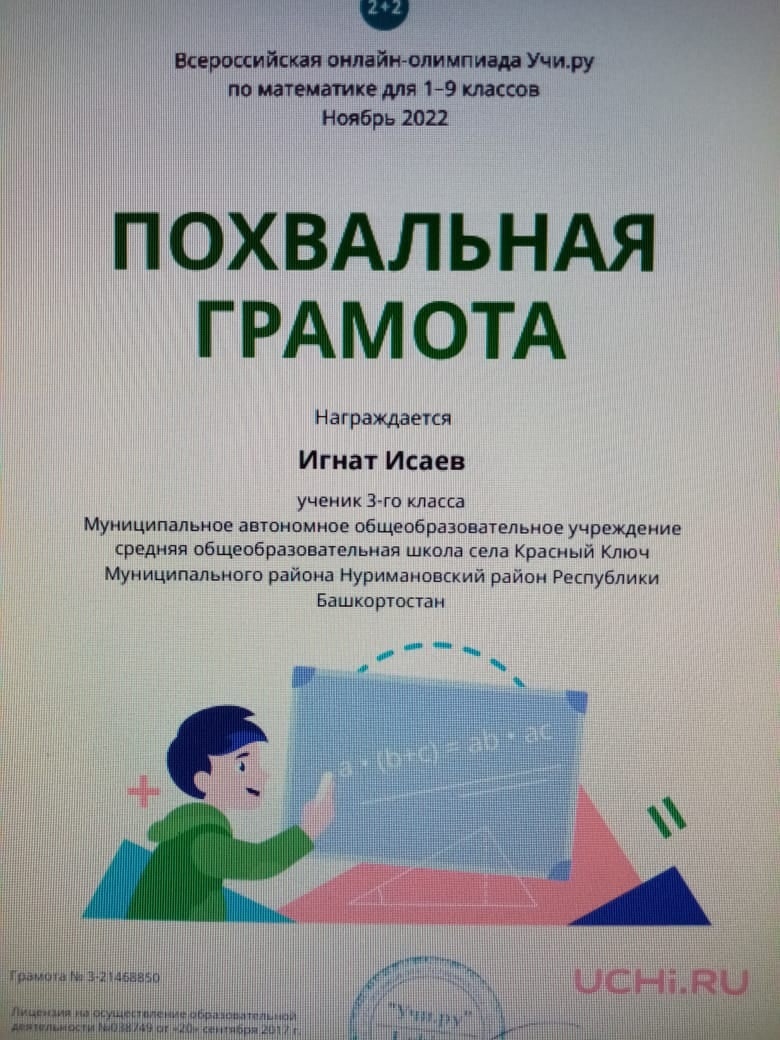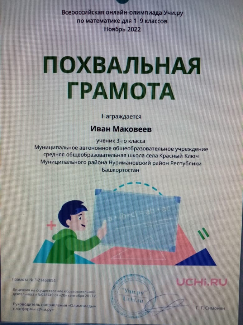 Дипломом победителя всероссийской онлайн-олимпиады по математике Учи.ру награждены