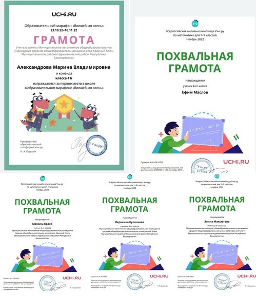 Еще у ребят из 4б класса отличные результаты во всероссийской онлайн-олимпиаде Учи.ру по математике - Похвальными грамотами награждены Максютова Элина, Кулачкова Вероника, Маслов Ефим и Краев Максим! Сертификатами участников олимпиады награждены Батракова Агата, Нуриахметова Алсу и Юшкова Анастасия. Поздравляем ребят и желаем им много новых ярких побед!