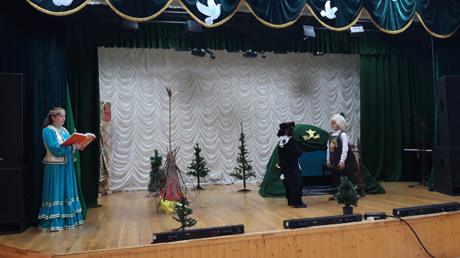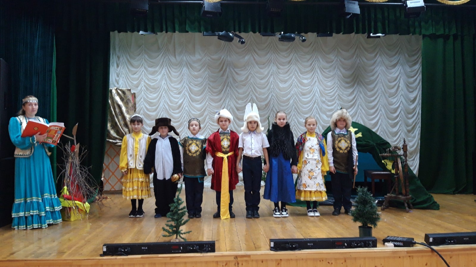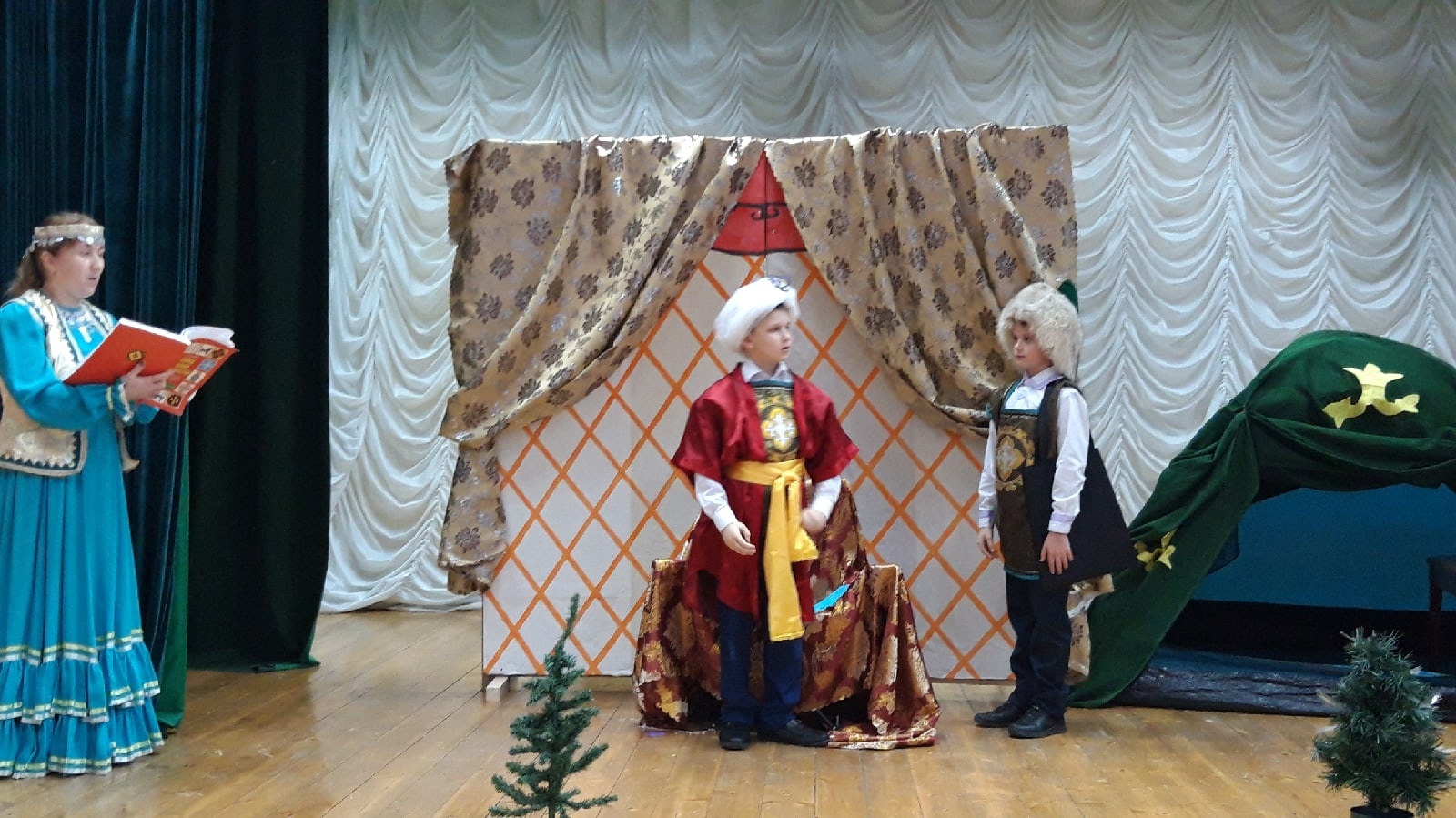 Маленькие артисты театрального кружка "В мире театра", ученики 3 классов, ставили спектакль башкирской народной сказки "Легенда о курае"