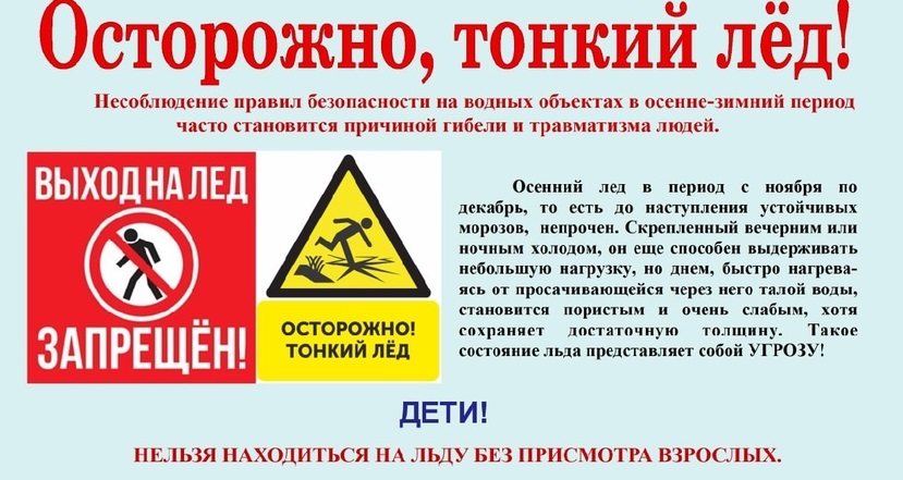 Ежегодно в осенне-зимний период на водных объектах гибнут люди, в том числе дети. Несоблюдение правил безопасности на водных объектах в осенне-зимний период часто приводит к трагедии.Осенний лед в период с ноября по декабрь, то есть до наступления устойчивых морозов, непрочен. Скрепленный вечерним или ночным холодом, он еще способен выдерживать небольшую нагрузку, но днем, быстро нагреваясь от просачивающейся через него талой воды, становится пористым и очень слабым, хотя сохраняет достаточную толщину.