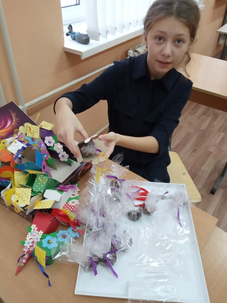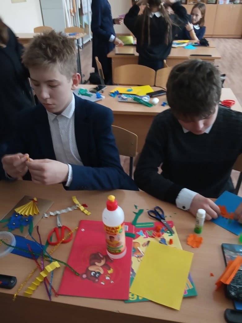 Ученики 7 классов на уроке трудов под руководством учителя Крестьяниновой Н.А. изготовили праздничные сувениры для мам своими руками. Ученики 7а класса приготовили конфеты в яркой упаковке, а ребята из 7б класса замечательные открытки.