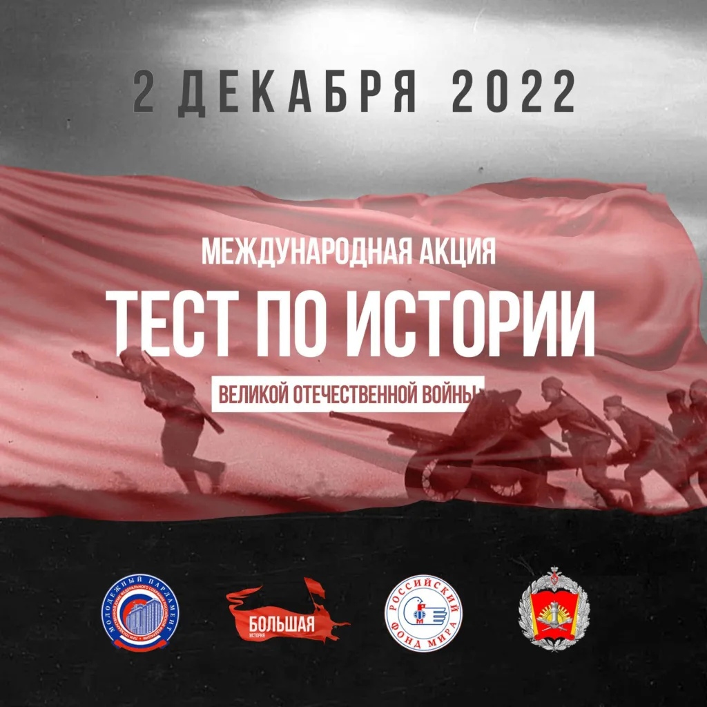 2 декабря 2022 года, накануне Дня Неизвестного солдата в России, состоится международная акция «Тест по истории Великой Отечественной войны». Мероприятие пройдет в рамках проекта «Большая История», который реализуют Молодежный парламент при Государственной Думе и молодежные парламенты субъектов Российской Федерации с 2015 года, и охватит все субъекты Российской Федерации, а также зарубежные страны.
