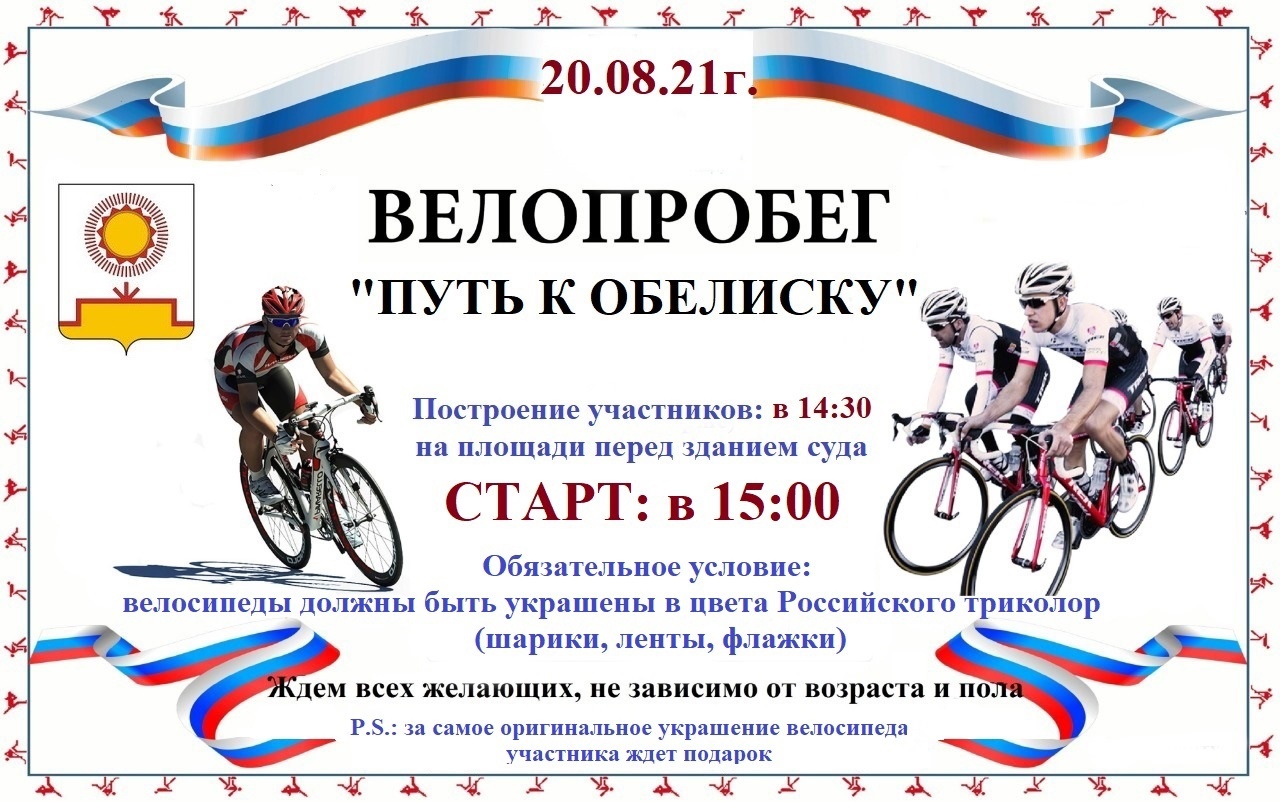 20 августа 2021 года в 14:30 приглашаем всех желающих принять активное участие в велопробеге, посвященном Дню Государственного Флага Российской Федерации.