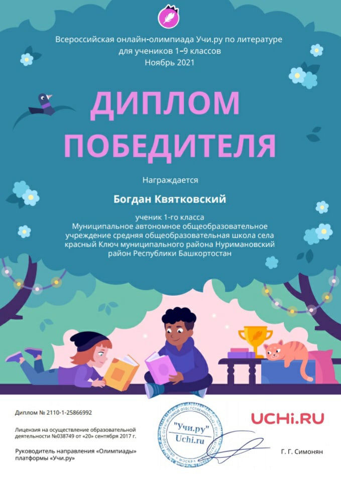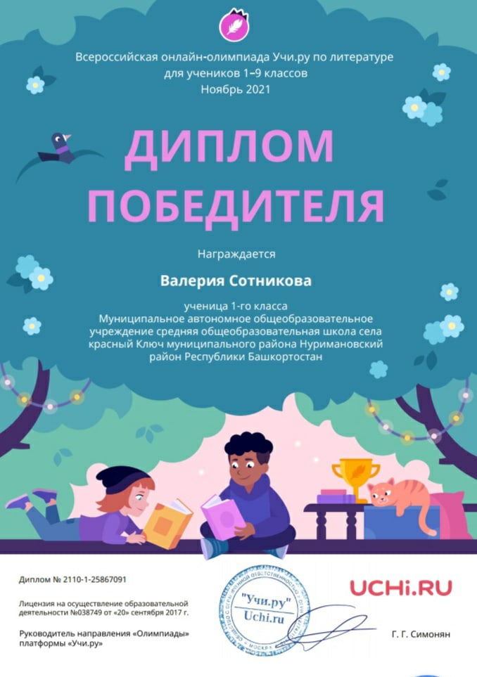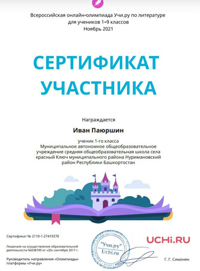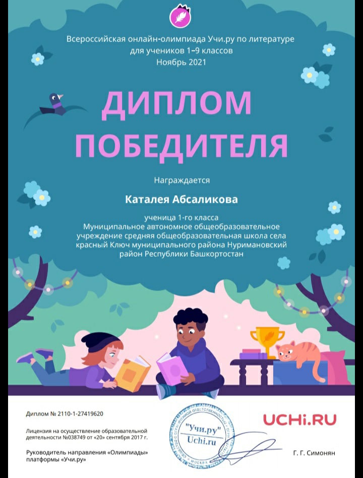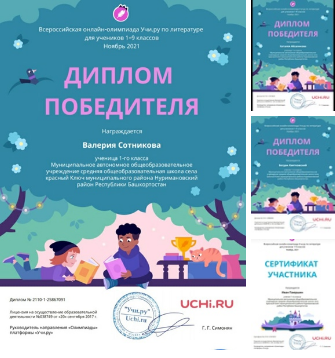 Итоги участия в онлайн-олимпиаде по литературе, организованной образовательным порталом Учи.ру среди учащихся 1а класса