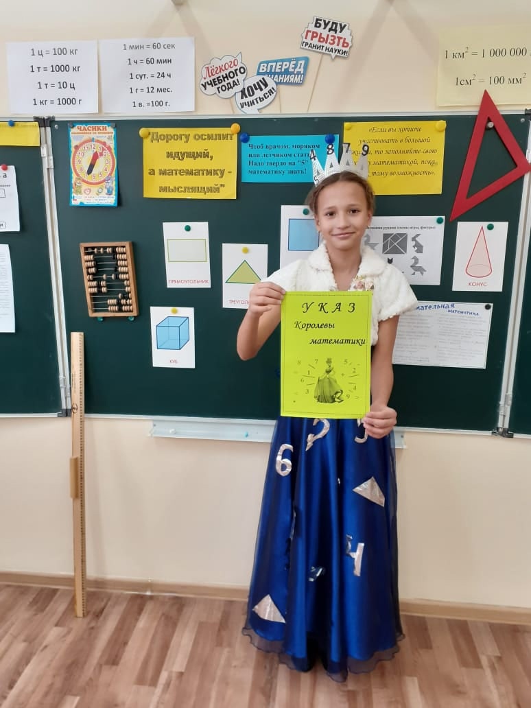С сегодняшнего дня в начальной школе стартовала Неделя Математики. На торжественное открытие Недели прибыла Королева самой точной из наук. Она огласила Указ об открытии Недели, познакомила ребят с планом мероприятий. В самое ближайшее время школьников ожидают викторины и увлекательные конкурсы.