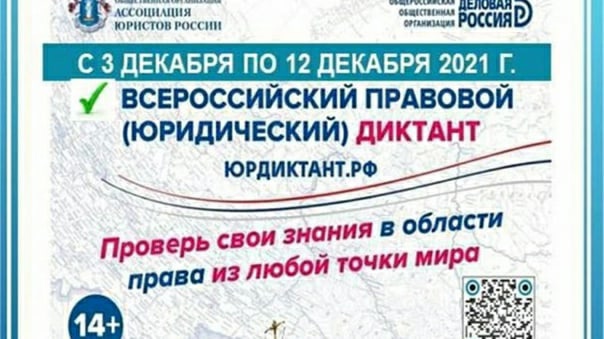 С 3 по 12 декабря 2021 года в режиме онлайн пройдет V Всероссийский правовой (юридический) диктант. Регистрироваться и проходить диктант можно в любой день, начиная с 3 декабря, на официальном сайте мероприятия юрдиктант.рф. Также доступно анонимное прохождение.