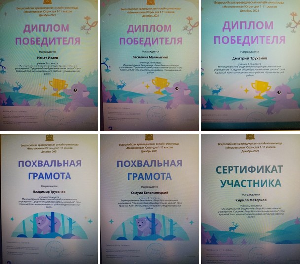Во Всероссийской краеведческой онлайн-олимпиаде "Многовековая Югра" приняли участие и учащиеся 2 а класса. Ребята результатами довольны: Дипломы победителей у Малмыгиной Василины, Исаева Игната, Труханова Дмитрия, Похвальные грамоты у Труханова Владимира, Белолипецкого Самуила, Сертификат участника у Матеркова Кирилла. Молодцы! Благодарим за участие ребят, родителей и классного руководителя 2а класса Пащенко Татьяну Яковлевну.