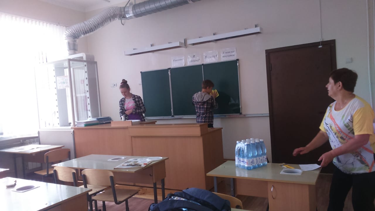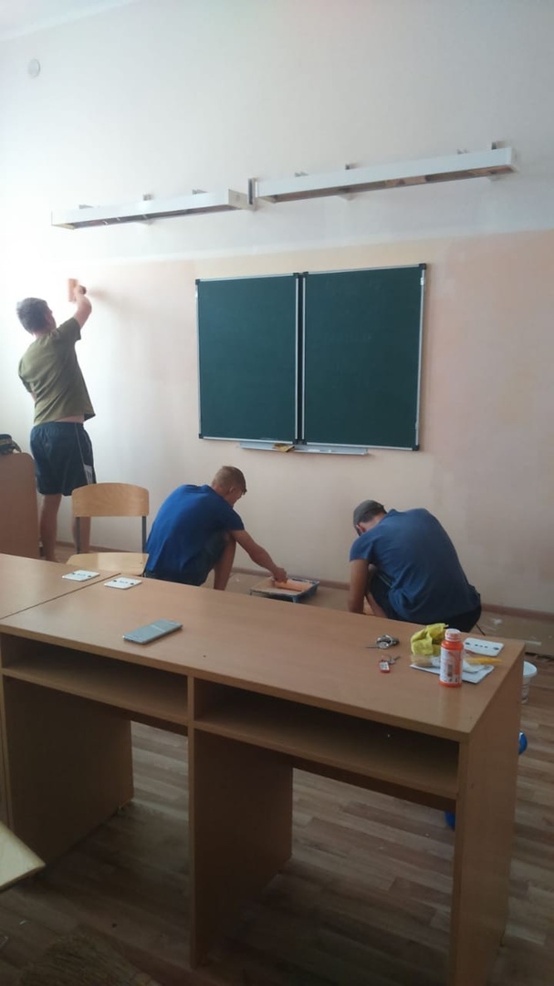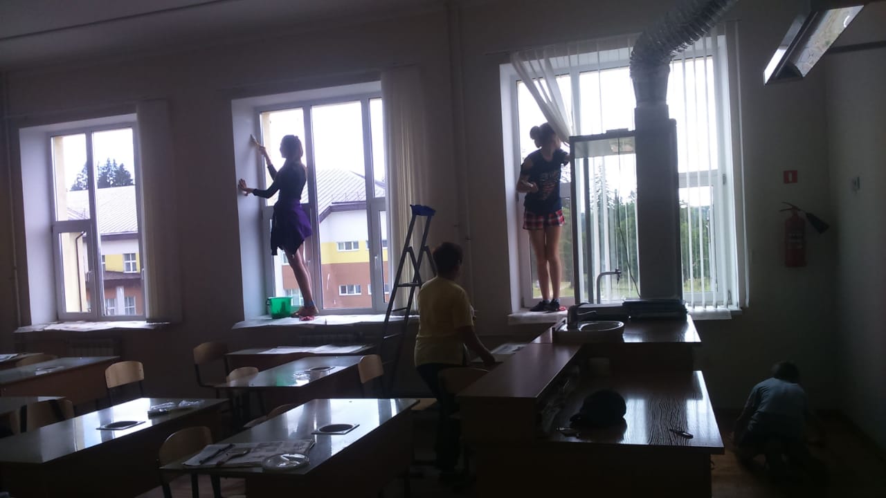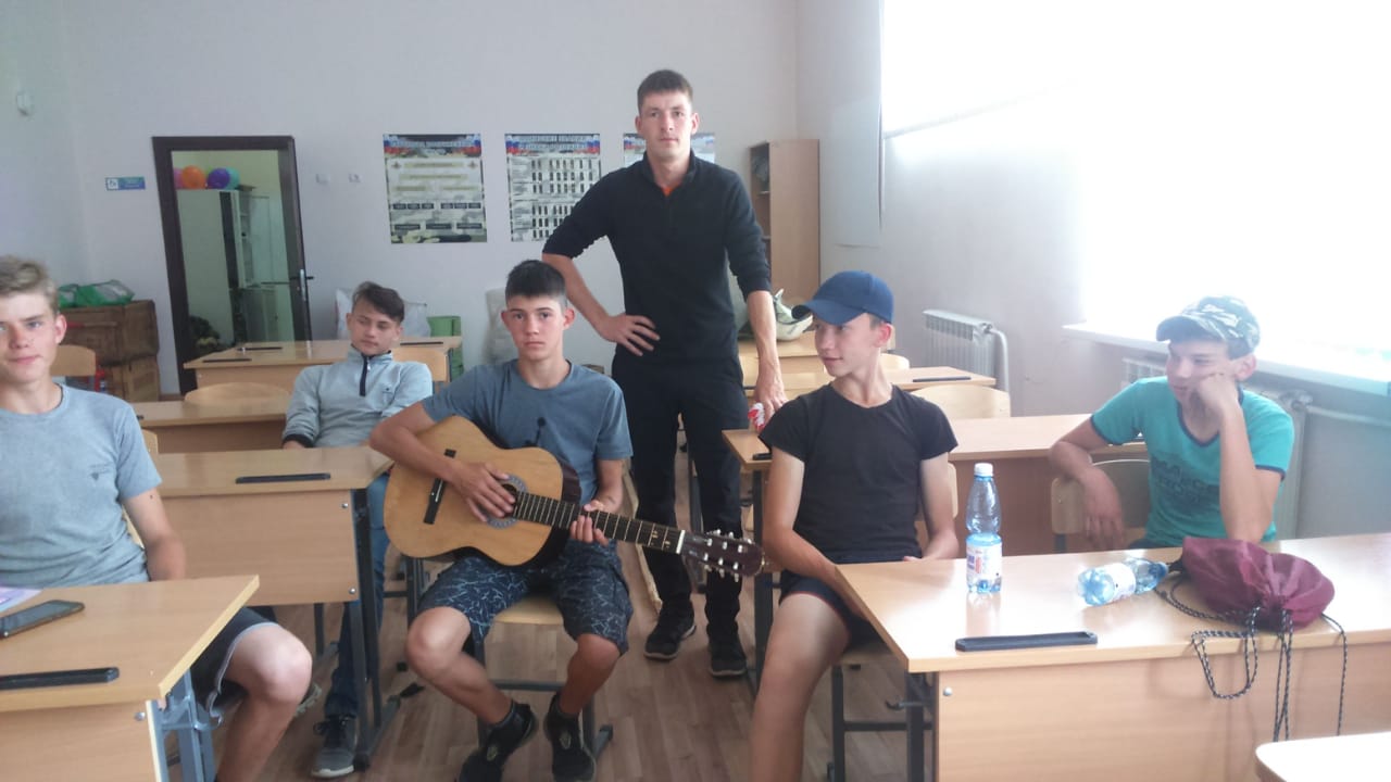 Лагерь труда и отдыха продолжает свою работу. Мы дружно готовимся к началу учебного года. Ремонт кабинетов в полном разгаре. В часы отдыха - песни под гитару...