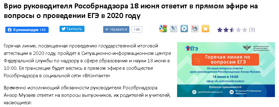 18 июня 2020 года врио руководителя Рособрнадзора А.А. Музаев будет отвечать в прямом эфире на вопросы о проведении ЕГЭ в 2020 году. Ссылка для подключения