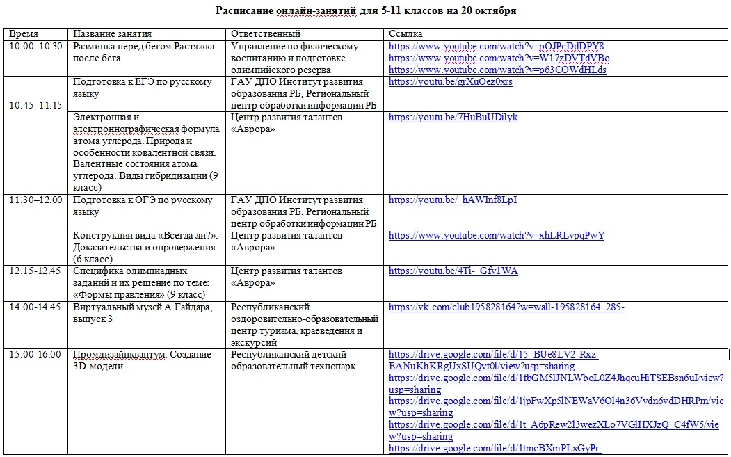 Расписание онлайн-занятий на 20 октября