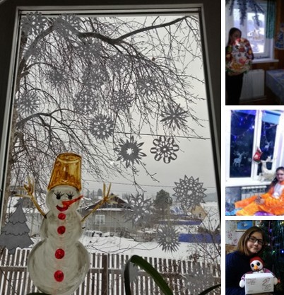 Новогодние окна от Рывкиной Ангелины, Ахметдиновой Камилы, Хурматуллиной Евы. Конкурс "Лучший снеговик" Саяповой Анны. 5б класс.