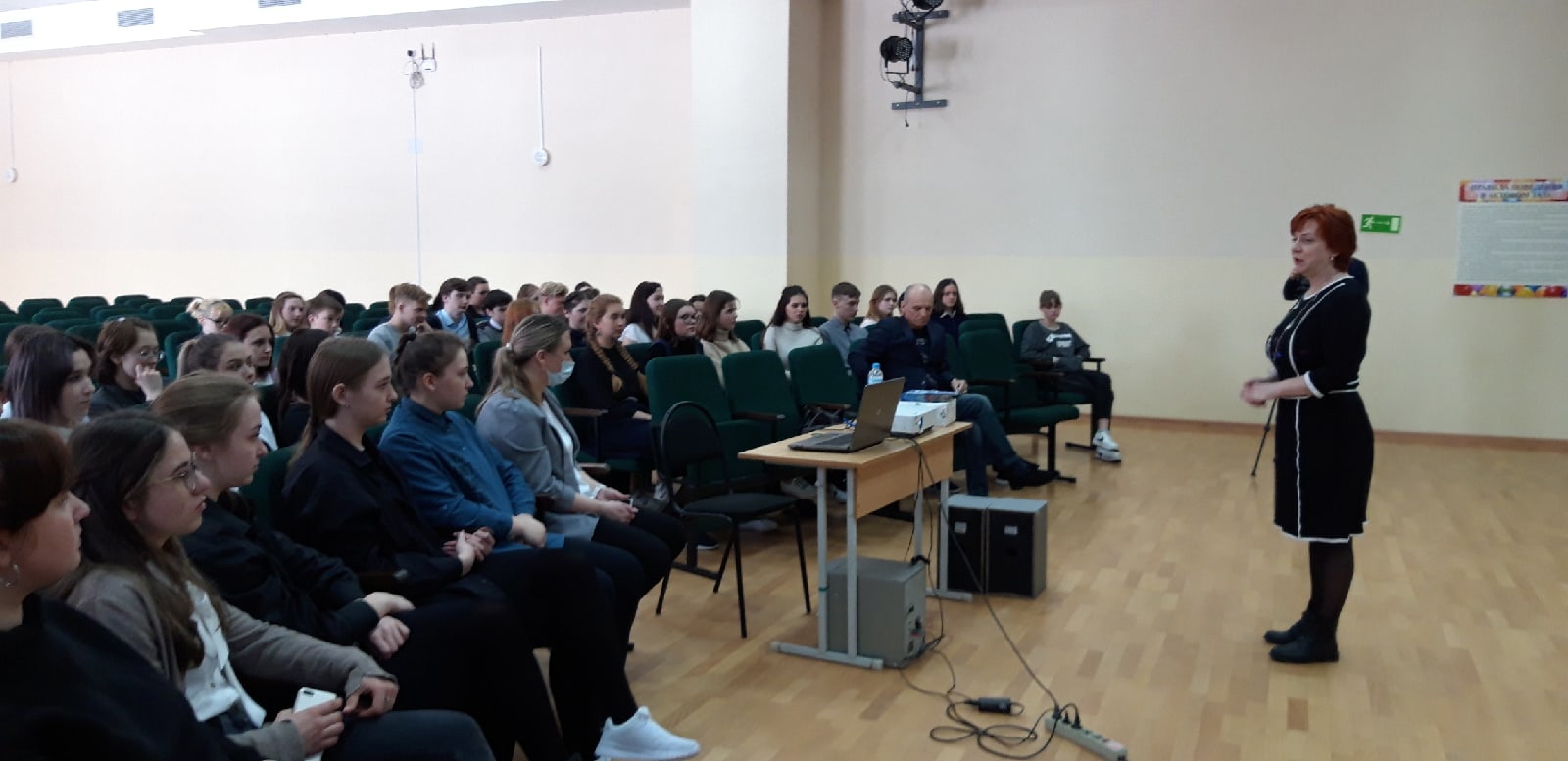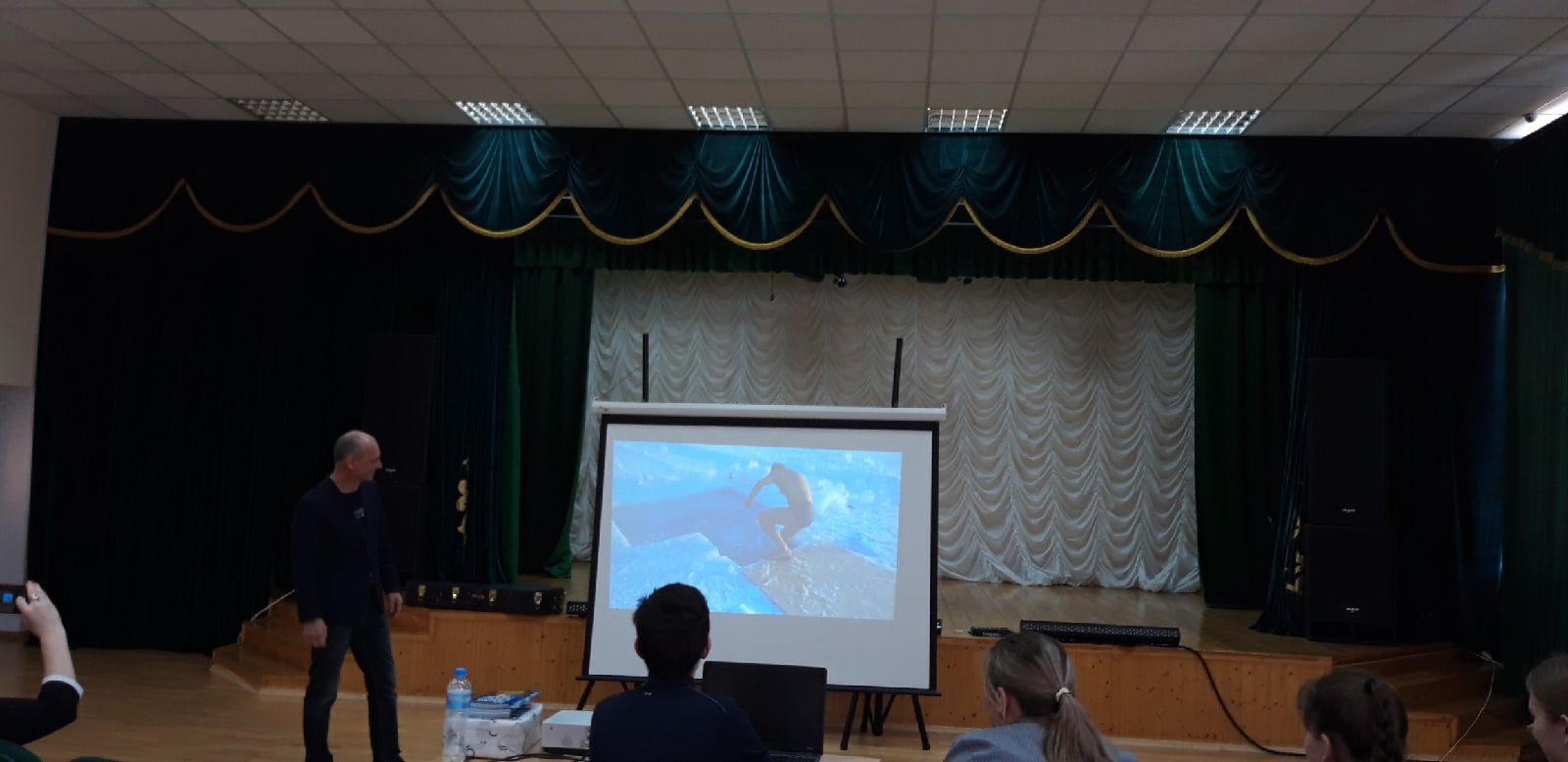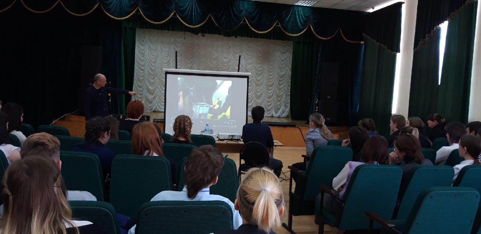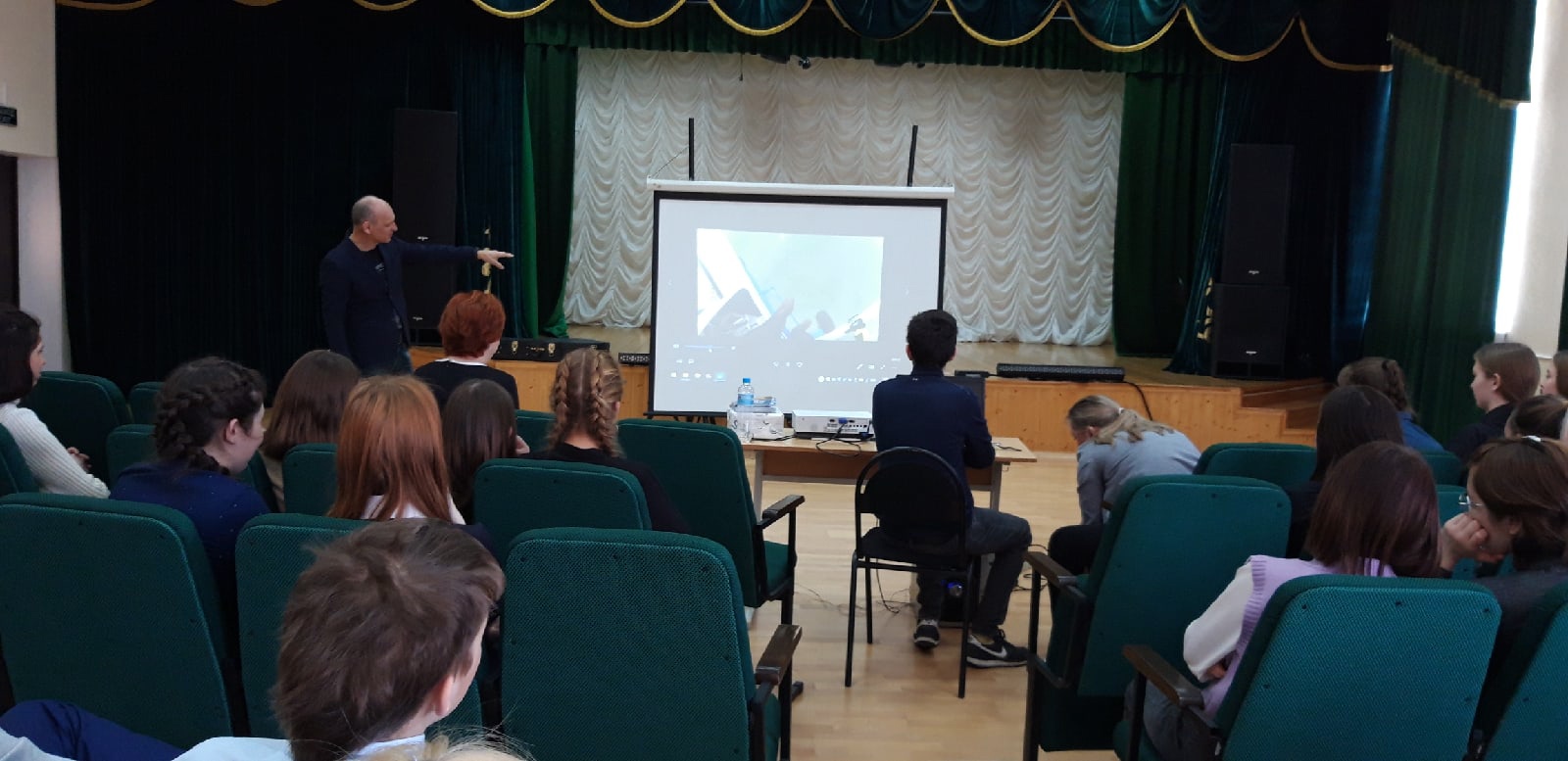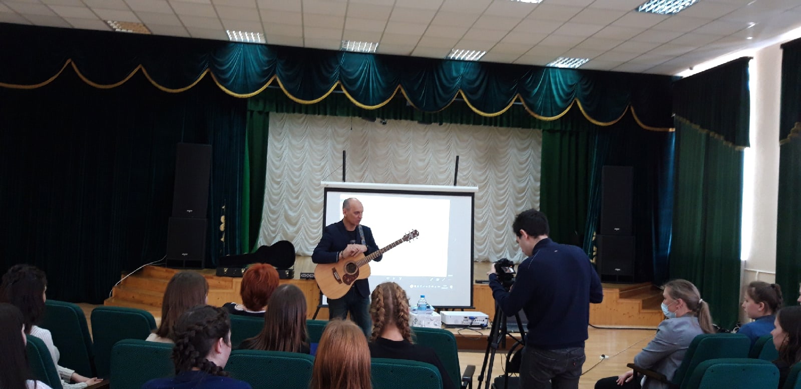 Затем выступил следующий гость - летчик-инструктор, парашютист, певец, композитор, поэт, Александр Борисович Лынник. Он рассказал ребятам о своей насыщенной жизни, как он научился прыгать с парашютом, управлять самолетом, как он покорил гору Эльбрус и многое другое. Познакомил слушателей с одним днем из жизни космонавта Михаила Борисовича Корнеенко, также спел свои авторские песни под гитару. Ребята слушали гостей с огромным интересом и вниманием, задавали вопросы, пели хором песни.