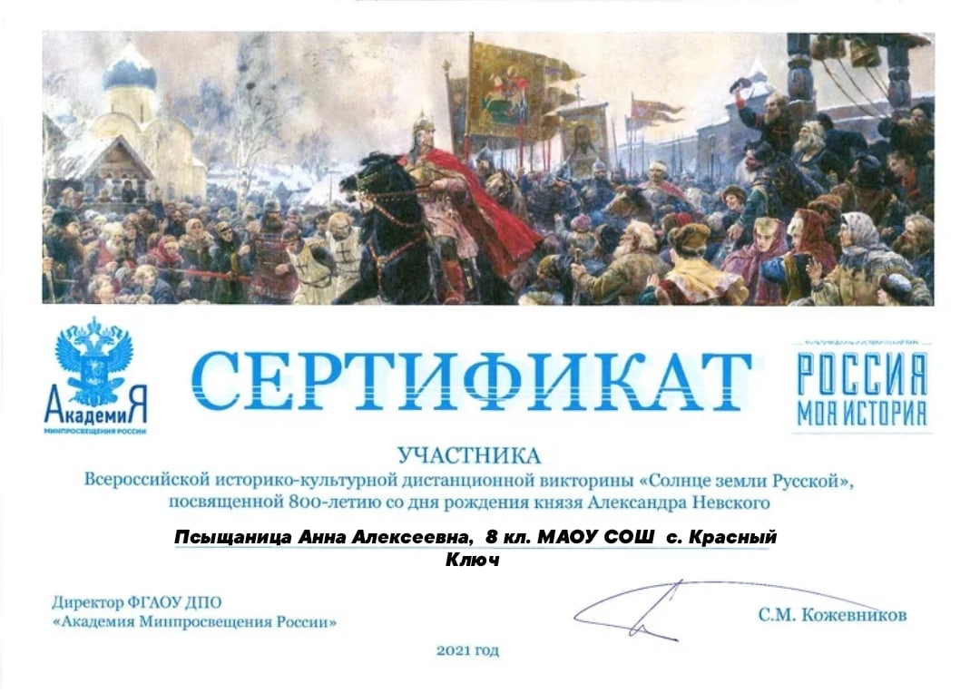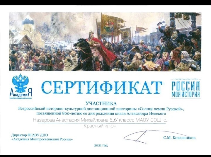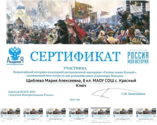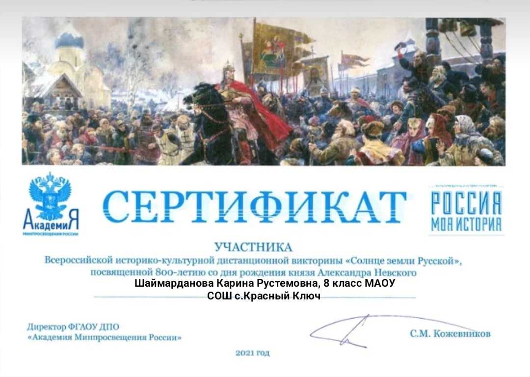 Активное участие во Всероссийской историко-культурной дистанционной викторине «Солнце земли Русской », посвященной 800-летию со дня рождения князя Александра Невского приняли учащиеся Лященко Анжелика, Назарова Анастасия, Ялилов Алмаз, Щиблева Мария, Байдуганова Анна, Псыщаница Анна, Березина Милена, Шаймарданова Карина, Сафиуллина Камилла, Чернышков Богдан, Макарова Арина, Туманов Игорь, Хурматуллин Арслан, Латыпова Гульнара, Шестакова Яна, Березуцкая Анастасия, Сенов Семен. Все учащиеся удостоены сертификатами за активное участие. Молодцы!