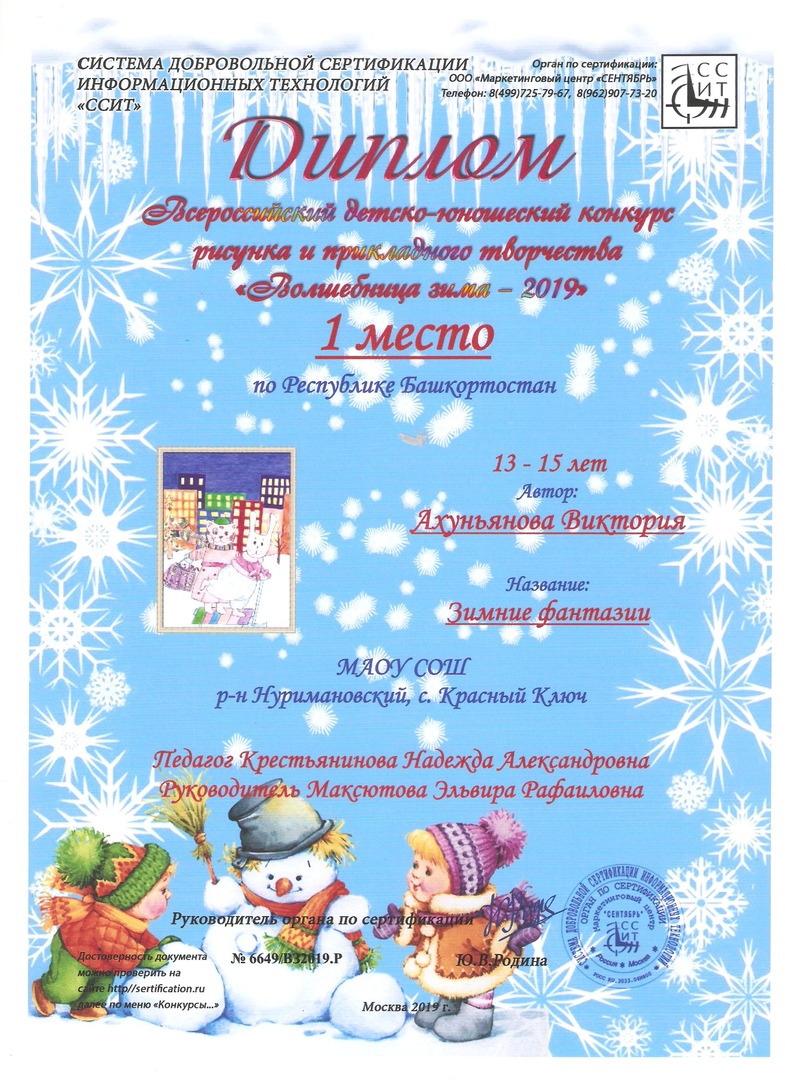 1 место по РБ в категории 13-15 лет было получила работа Ахуньяновой Виктории ("Зимние фантазии").