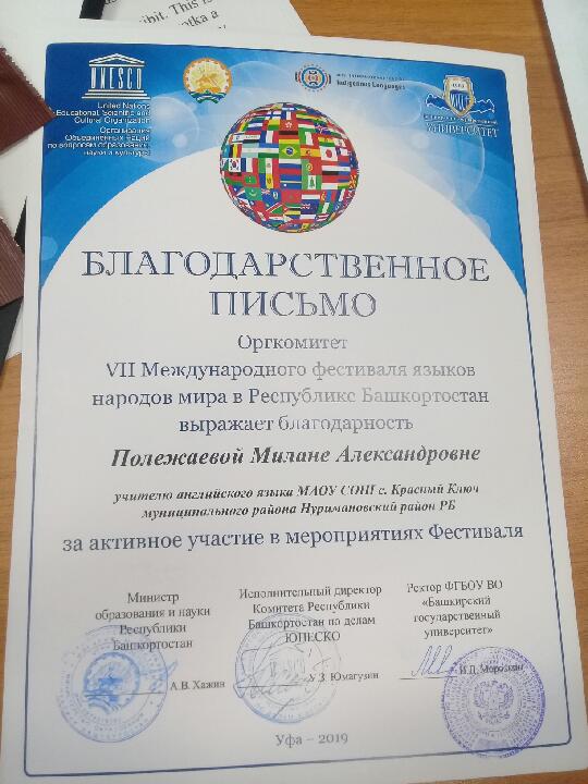 17 декабря в Башкирском государственном университете состоялся VII Международный фестиваль народов мира в Республике Башкортостан. Нашу школу достойно представили ученица 10 класса Касьянова Алёна и учитель английского языка Полежаева Милана Александровна.