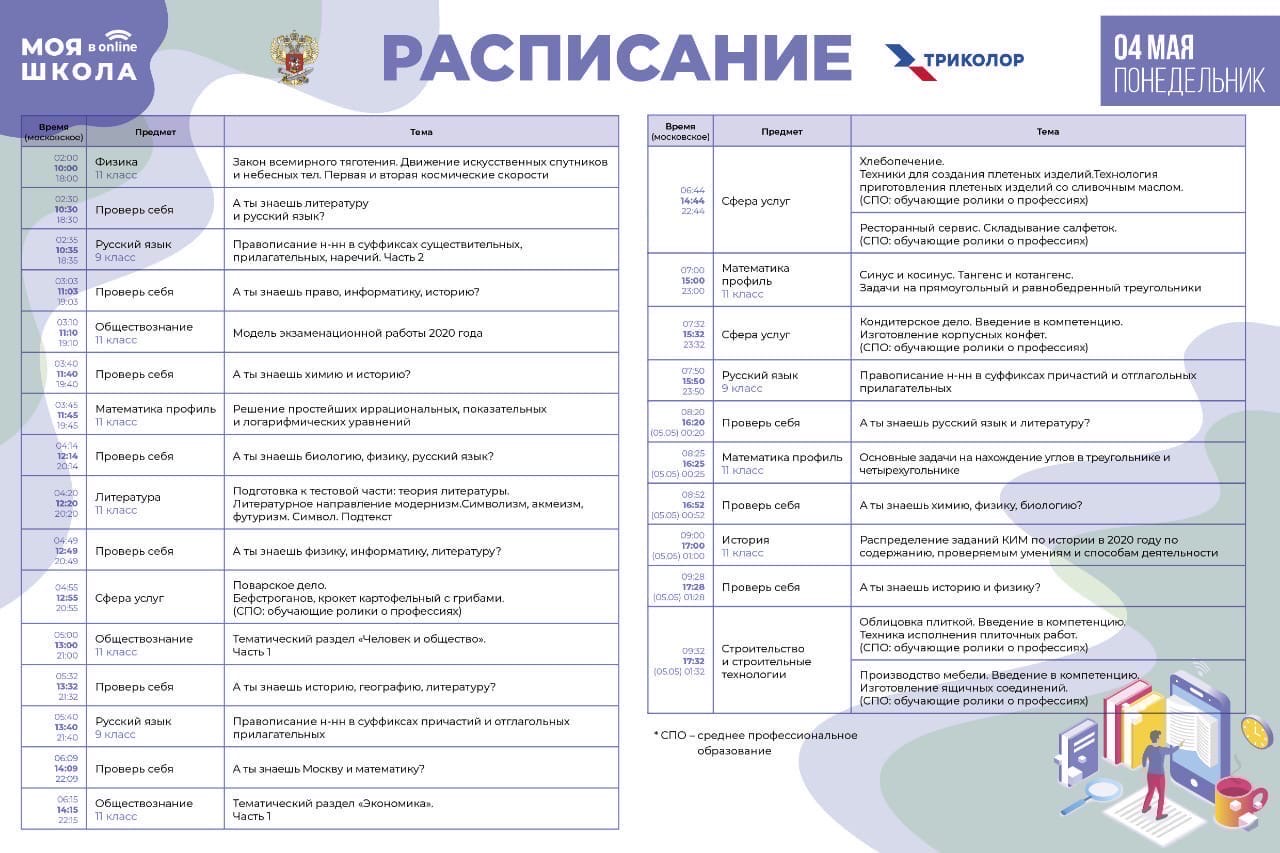 Расписание трансляций телевизионных уроков на 4 мая. Телеканалы: Общественное телевидении России (ОТР) и «Триколор».