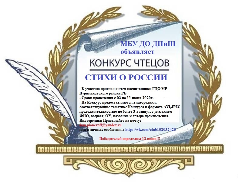 Нуримановский район, с. Красная Горка, ул. Советская 97, муниципальное бюджетное учреждение дополнительного образования Дом пионеров и школьников, тел. 8-347-76-2-27-55, по электронному адресу dom.pioneroff@yanex.ru до 11.06.2020 г.