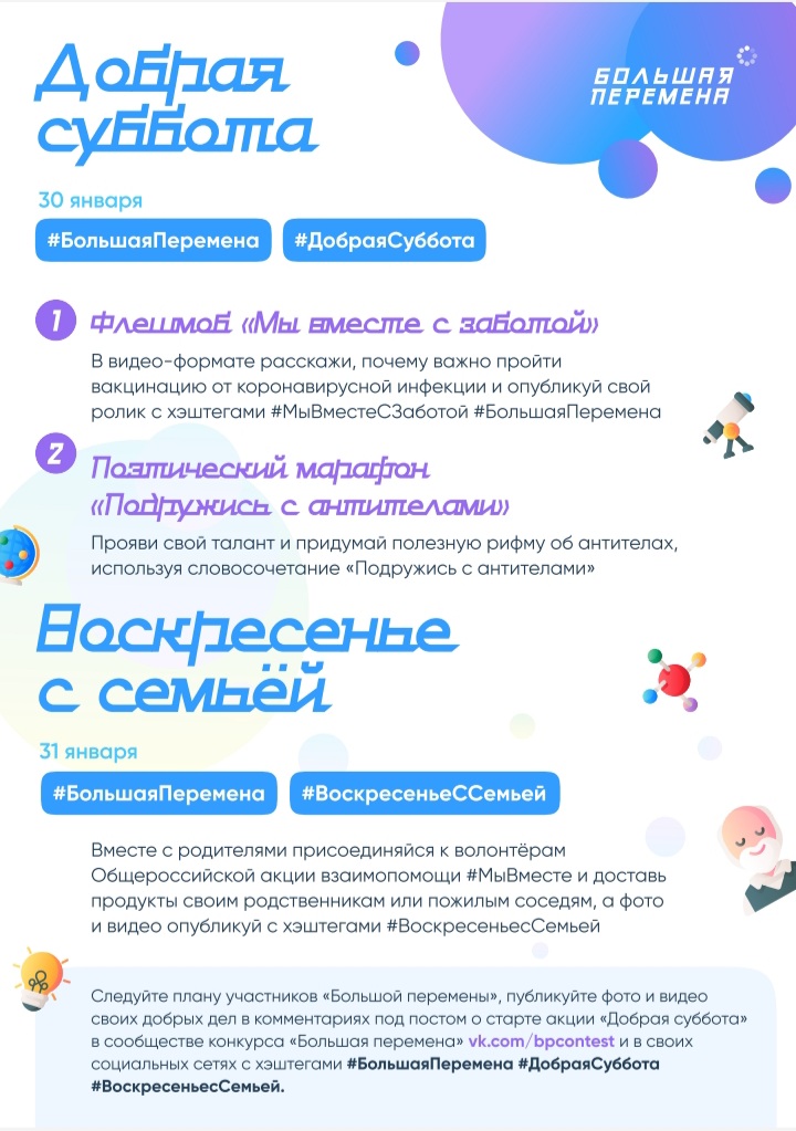 Участники Всероссийского конкурса для школьников «Большая перемена» – проекта президентской платформы «Россия – страна возможностей» – в рамках еженедельной акции «Добрая суббота» присоединятся к проекту Всероссийской акции взаимопомощи #МыВместе по информированию граждан о вакцинации от коронавирусной инфекции.