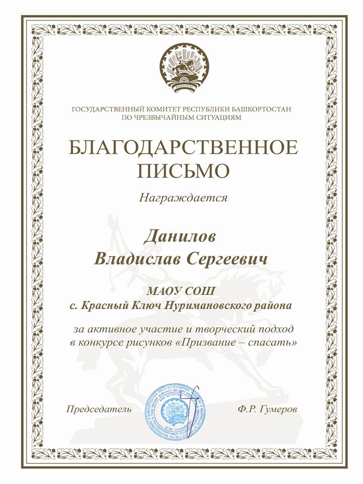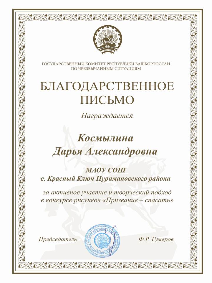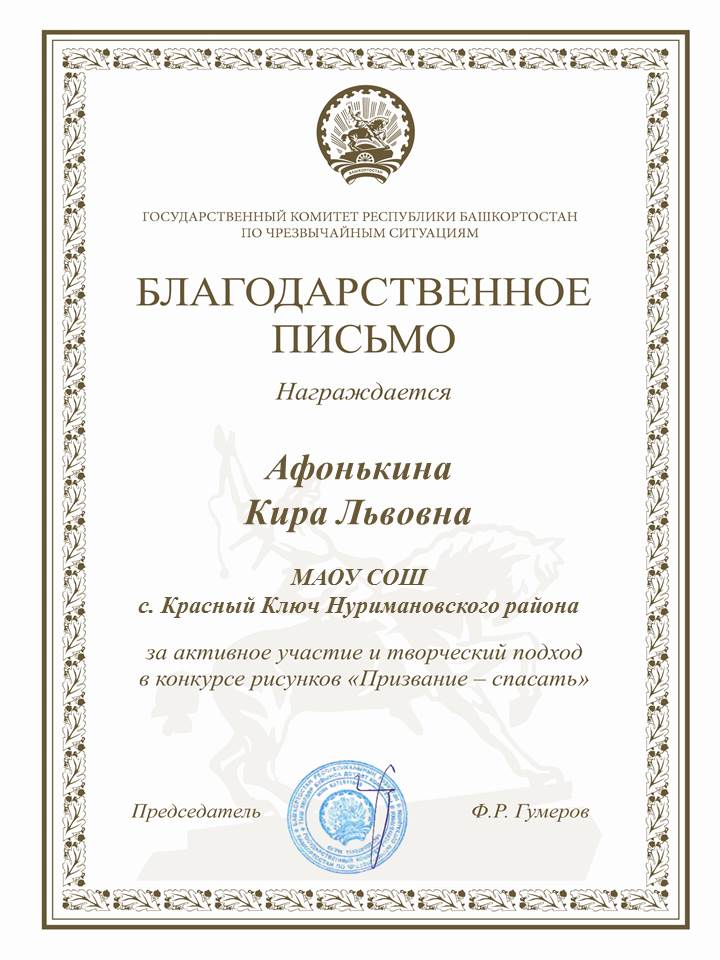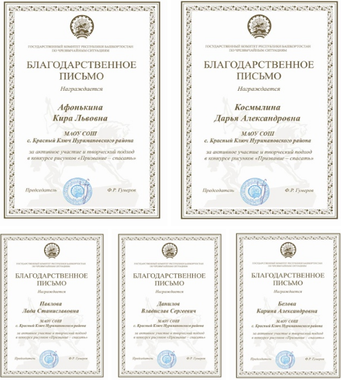 В декабре 2020 года обучающиеся 5, 6 классов: Афонькина Кира, Космылина Дарья, Павлова Лада, Данилов Владислав, Белова Карина приняли участие в Республиканском конкурсе-рисунков "Призвание - спасать", который проводил Государственный комитет Республики Башкортостан по чрезвычайным ситуациям. Всем участникам пришли именные благодарственные письма. Руководитель Крестьянинова Надежда Александровна. Поздравляем всех участников конкурса!!!