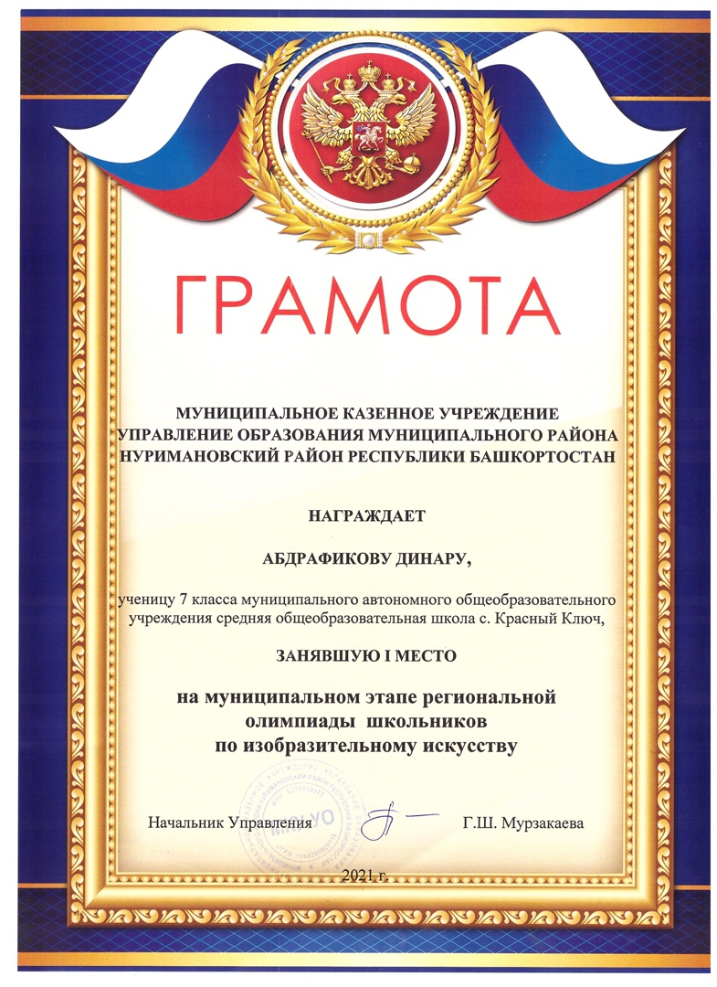 Сегодня мы поздравляем ученицу 7 класса Абдрафикову Динару, занявшую 1 место на муниципальном этапе региональной олимпиады школьников по изобразительному искусству (руководитель Крестьянинова Надежда Александровна). Желаем Динаре победы в заключительном этапе олимпиады!