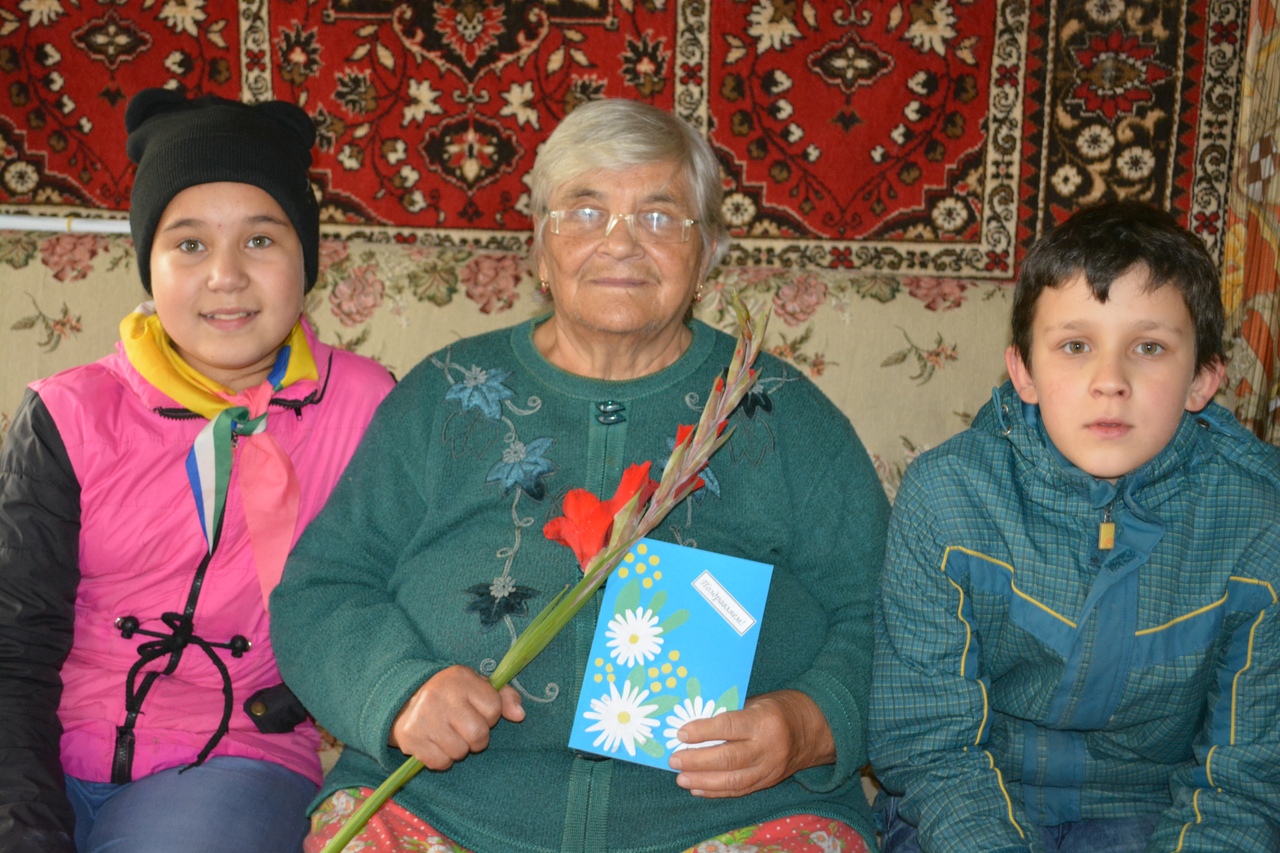 Ребята подарили открытки и цветы, поздравили с днем пожилых людей, пожелав здоровья и долголетия, а радушные хозяйки не отпустили нас без сладких гостинцев.