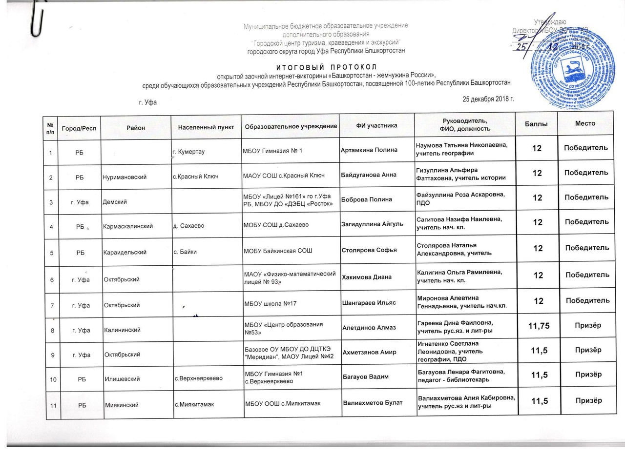 25 декабря 2018 г. были подведены итоги открытой заочной интернет – викторины «Башкортостан – жемчужина России», посвященной 100-летию Республики Башкортостан.