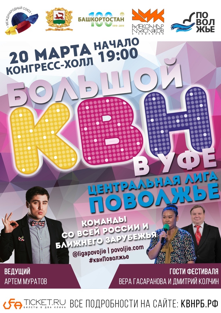 Друзья, 20 марта в Уфе пройдет большое КВН-событие - Фестиваль Центральной лиги КВН "Поволжье". На одной сцене соберутся команды со всей России и ближнего зарубежья!