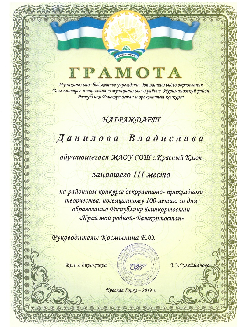 Поздравляем призера и и участников районного декоративно-прикладного творчества, посвященного 100-летию образования Республики Башкортостан "Край мой родной - Башкортостан"!